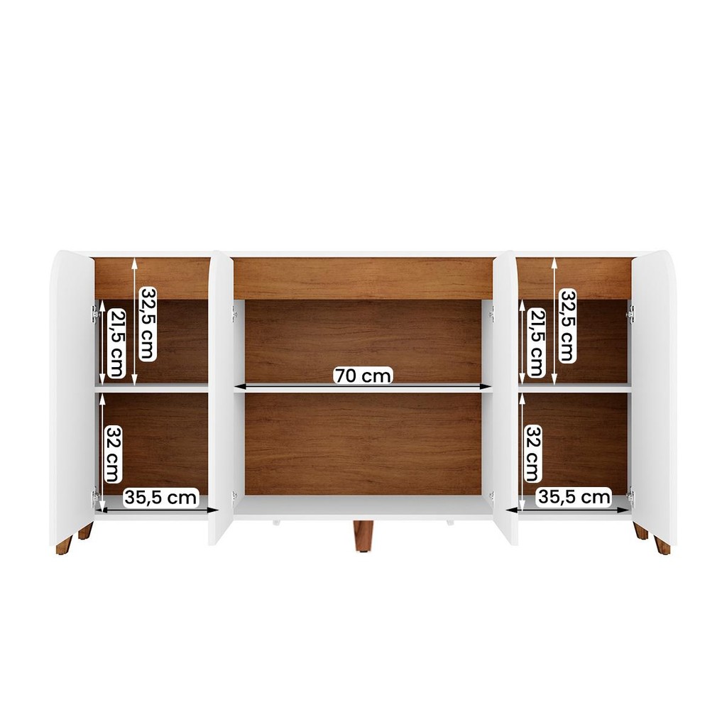 Perfeito para trazer a organização que falta na sua sala de jantar ou estar, o Buffet Memphis é também um complemento e tanto para o lar-style. Com destaque para o espaço interno, que acomoda louças, copos e utensílios para auxiliar naqueles momentos de confraternização, o tampo também é um grande aliado, pois apoia desde itens decorativos até bandejas com as melhores receitas para aquelas refeições em família. Elaborado em MDP e MDF, seu tampo é usinado e cantos do produto são arredondados dando mais sofisticação ao móvel. Modelo: Buffet Memphis; Material da estrutura: em MDF, MDP. Tampo e portas em MDF 15mm, base e laterais em MDP 15mm com pés de madeira maciça; Dimensões: 165 cm(L) x 80 cm(A) x 36 cm(P); Quantidade de portas: 04 (dobradiças metálicas); Com puxador: não se aplica; Quantidade prateleiras: 03; Contém adega: não; Peso suportado: até 75 kg distribuídos; Requer montagem: Sim (kit montagem incluso); Tonalidade das Cores: Branco: Semi- Fosco; Cedro: Semi-Fosco; Off White: Semi-Fosco. Informações adicionais: - Os objetos que ambientam as fotos não acompanham o produto; - É de inteira responsabilidade do cliente a montagem do produto e/ou instalação, assim como possíveis irregularidades provenientes de manuseio inadequado; - Embora o produto acompanhe o manual de montagem, verifique a complexidade antes de decidir montá-lo sozinho, recomendamos que contrate um profissional de sua confiança; - Fique atento, nossas cores podem sofrer alterações dependendo do seu monitor; - ANTES DE MONTAR O SEU PRODUTO, verifique se há alguma peça danificada, caso esteja, prestaremos a devida assistência dentro do prazo da garantia.