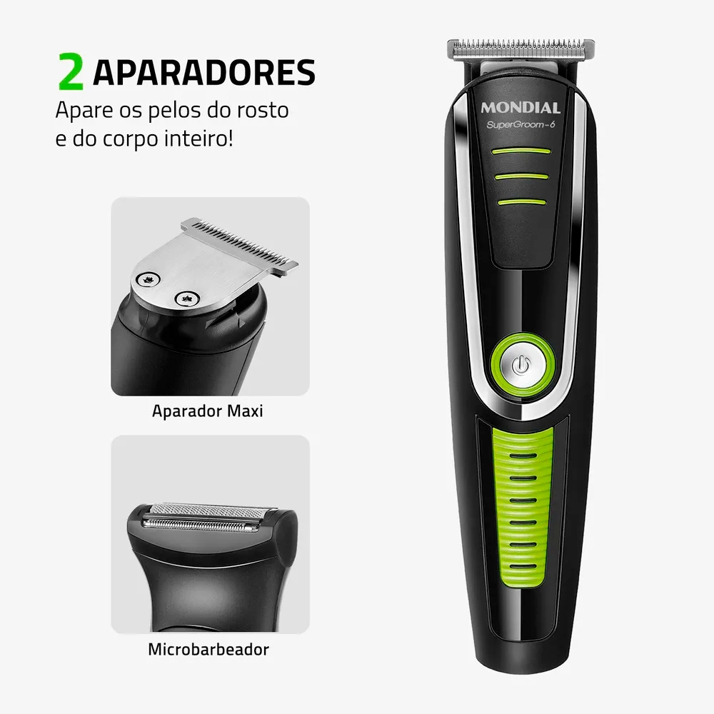 Aparador de Pelos Barbeador 4 pentes de corte Super Groom 6 BG-04 Bivolt Preto Verde Mondial