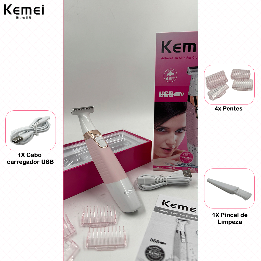 Aparador de Pelos Feminino Kemei KM-1900 3W Recarregável, Lavável e Resistente à Água Sem Fio Portátil Bivolt