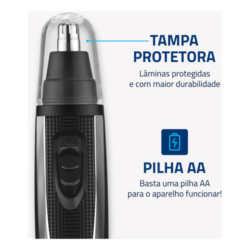DESCRIÇÃO COMPLETA: O Aparador de Pelos Mondial Classic TR-01 é a solução prática e eficiente para remover pelos indesejados do nariz e das orelhas. Com lâminas rotativas super eficientes, proporciona um corte preciso e sem desconforto. Seu design compacto e leve facilita o manuseio, garantindo mais controle e conforto durante o uso. Além disso, funciona com apenas 1 pilha AA, tornando-o ideal para viagens e uso diário. Características: Marca: Mondial Modelo: TR-01 Especificações: Cor: Preto/Prata Potência: 0,8W Alimentação: Pilha AA (não inclusa) Uso: Somente seco Lâminas: Rotativas super eficientes Design: Compacto e leve Tampa protetora Dimensões: 14x3x3 cm (AxLxC) Conteúdo da Embalagem: 1 Aparador de Pelos Mondial Classic TR-01 1 Manual de Instruções Garantia: 12 meses Peso: 0,50g