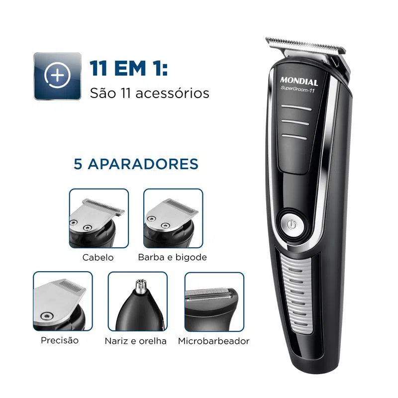 11 EM 1 - MÚLTIPLAS FUNÇÕES SÃO 11 ACESSÓRIOS: Tipos de aparadores, pentes de corte com opções de altura. Os diferentes acessórios possibilitam múltiplas funções: aparador de cabelo, barba e bigode, aparador para nariz e orelha, entre outros. Além disso, o micro barbeador é de alta precisão. Você pode ter uma aparência impecável sem sair de casa! LÂMINAS DE INOX As lâminas em aço inox asseguram um corterente, preciso e suave. Além disso, garantem maior durabilidade ao produto. BATERIA RECARREGÁVEL A bateria de Íon Lítio recarregável proporciona uma autonomia maior durante o uso do aparador. Ele pode ser utilizado sem fio por até 90 minutos. A liberdade de levar e utilizar seu aparelho onde você quiser! PENTES DE CORTE O aparador acompanha 5 Pentes Guia com alturas de 3, 6, 9, 12 e 15 milímetros, além de pente ajustável para aparar a barba. Você pode escolher a opção ideal para seu corte e estilo. Caracteristicas: - Marca: Mondial - Modelo: BG-05 - Voltagem: Bivolt Especificações técnicas: - Lâmina: Lâminas em aço Inox - Recarregável: Sim - Alimentação: Energia Elétrica - Tipo de tomada: 10A - Uso seco ou molhado: Uso apenas seco - Funções: Aparador, microbarbeador e cortador - Uso sem fio: Sim - Indicador de bateria: Sim Dimensões: - Altura: 19 cm - Largura: 17 cm - Profundidade: 15,5cm - Peso: 134g Conteudo da embalagem: - 1 Aparador de pelos completo - 5 Cabeças aparadoras - 5 Pentes de corte (3 mm, 6 mm, 9 mm, 12 mm, 15 mm) - 1 pente ajustável (16 comprimentos) - 1 Óleo lubrificante - 1 Carregador - 1 Base carregadora - Manual de Instruções