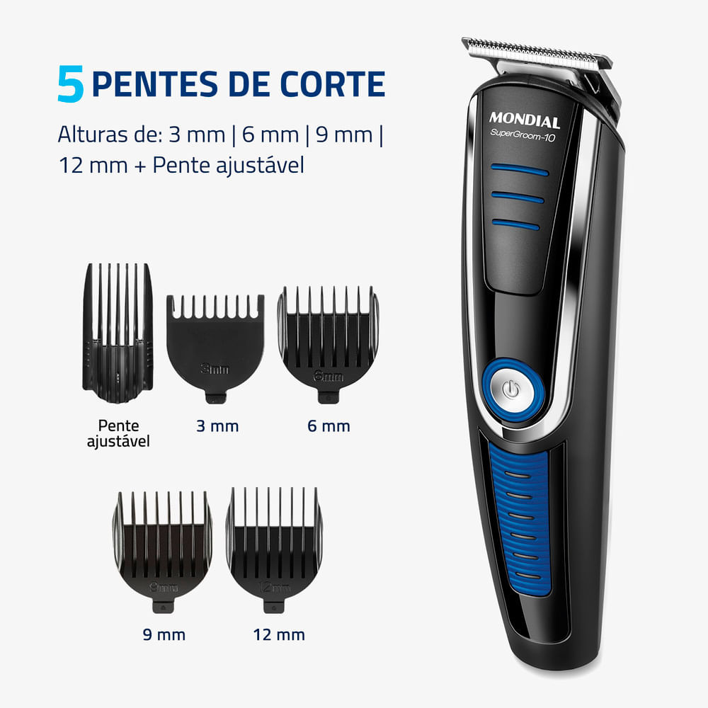 O Aparador de Pelos SuperGroom Mondial possui a funcionalidade de 10 produtos em apenas 1! Conta com 5 aparadores para cabelo, rosto e corpo, 4 pentes de corte com guias de 3, 6, 9 e 12mm, além de pente ajustável para a remoção dos pelos no comprimento que preferir. Suas lâminas em aço inox oferece alto desempenho para um corte rente, preciso e suave. Saiba mais sobre o BG-03 da Mondial: 10 EM 1 - MÚLTIPLAS FUNÇÕES: O aparador de pelos da Mondial vem com 10 acessórios: são 5 tipos de aparadores de alto desempenho e 5 pentes de corte com diferentes opções de altura para aparar e remover os pelos do rosto e do corpo inteiro. Você pode ter uma aparência impecável sem sair de casa! PENTES DE CORTE + PENTE AJUSTÁVEL: Acompanha 4 pentes de corte com 3mm, 6mm, 9mm e 12mm, além de pente ajustável com 16 níveis de altura, para aparar os pelos no comprimento que preferir. APARADOR DE CABELO: Ideal para aparar os pelos do rosto, pescoço e corpo com total praticidade. Garante o corte rente à pele quando usado sem pente de corte. APARADOR DE BARBA E BIGODE + PRECISÃO: Os aparadores são perfeitos para aparar com precisão a barba e áreas menores, como pequenas linhas e detalhes. APARADOR PARA NARIZ E ORELHA: Remove os pelos do nariz e orelhas com total conforto e praticidade. MICROBARBEADOR: Sistema exclusivo para aparar e raspar com suavidade os pelos rente à pele. LÂMINAS EM AÇO INOX: As lâminas em aço inox asseguram um corte rente, preciso e suave. Além disso, garantem maior durabilidade ao produto. MAIS TEMPO DE USO: A bateria recarregável de Ion Lithium garante até 90 minutos de uso sem fio. Além disso, o produto é bivolt, perfeito para usar em qualquer lugar! BASE CARREGADORA: Perfeita para armazenar e recarregar o aparador diretamente na base. LUZ INDICADORA: Indica o nível da bateria para carregamento. UM ANO DE GARANTIA MONDIAL: A Mondial é a escolha de milhões de consumidores. Mondial, a escolha inteligente!