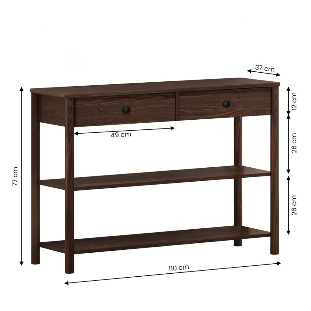 O Aparador Multifuncional Decorativo Madeira Imbuia Apoana reúne elegância e utilidade com um toque clássico. Fabricado em madeira maciça com acabamento escuro Imbuia, traz sofisticação ao espaço e destaca a textura natural da madeira com profundidade e personalidade. Seu design versátil combina com ambientes modernos, retrô ou tradicionais. Os cantos suavemente arredondados e a estrutura firme transmitem segurança e qualidade. As duas gavetas com puxadores embutidos e corrediças metálicas organizam com praticidade, enquanto as prateleiras inferiores otimizam o espaço para livros, cestos ou objetos decorativos. Com medidas compactas — 110 cm de largura por 37 cm de profundidade — é perfeito para quem busca um móvel funcional que se encaixa bem em espaços reduzidos. Ideal como aparador na sala, bancada no home office ou até como penteadeira discreta. Dimensões do Produto Largura: 110 cm Altura: 77,6 cm Profundidade: 37 cm Peso: 18 Kg Materiais e Acabamento Material da Estrutura: Madeira Maciça - Finger Tipo da Madeira: Pinus Escala de Brilho: Fosco Material dos Pés: Pinus Maciço Recomendação de Limpeza: Utilize pano levemente úmido Características do Produto Quantidade de Gavetas: 2 Quantidade de Prateleiras: 2 Quantidade de Basculantes: 0 Possui Rodízio: Não Estilo: Escandinavo Ambiente Principal: Hall de Entrada Precisa de Montagem: Sim Sistema de Montagem: Minifix / Cavilhas / Parafusos Complexidade da Montagem: Médio Volumes: 01 Garantia do Fabricante: 12 meses Manual de Montagem: Sim Diferenciais Produto Versátil Design Moderno/Rústico Madeira Maciça Mais Resistente que MDF Móvel Sustentável Madeira Certificada Pintura Livre de Solventes Produto Qualidade Europeia Informações Importantes Montagem e Desmontagem não inclusa ao produto, de responsabilidade do cliente. Não nos responsabilizamos, no ato da entrega, por subir escadas/elevadores ou transporte por guincho em apartamentos. Eventuais despesas são de responsabilidade do comprador. Ao receber a mercadoria, o cliente deve verificar as condições da embalagem. Caso haja alguma avaria, não assine o comprovante de recebimento. Objetos que ambientam as fotos não acompanham o produto. Imagens meramente ilustrativas. Cores e tonalidades podem variar. O conjunto não pode ficar exposto ao sol ou chuva.