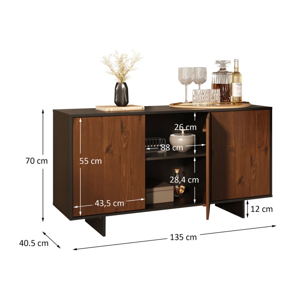 Feito de Madeira. Feito para durar. O Buffet de 3 Portas Madeira Maciça Arto é a escolha ideal para quem busca elegância, funcionalidade e um móvel de presença marcante na decoração. Produzido em madeira na tonalidade Castanho, ele combina robustez e sofisticação em um design minimalista. As portas contam com sistema de abertura em fecho-toque, dispensando puxadores e garantindo um visual limpo e contemporâneo. Internamente, oferece excelente aproveitamento: atrás da primeira porta há duas divisórias, enquanto a segunda e terceira portas compartilham um amplo espaço com prateleira central. Todas as prateleiras possuem 3 níveis de regulagem, permitindo ao cliente personalizar a altura conforme sua necessidade de organização. A base sólida com pés laterais tipo bloco reforça a estabilidade e imprime modernidade ao móvel, tornando-o uma peça versátil para diferentes ambientes, seja no living, sala de jantar ou home office. Mais do que um móvel, este buffet é um verdadeiro investimento em durabilidade, estilo e praticidade. Dimensões do Produto: Largura: 135 cm | Altura: 70 cm | Profundidade: 40,5 cm | Peso: 36 Kg Materiais e Acabamento: Material da Estrutura: Madeira Maciça - Finger | Tipo da Madeira Portas: Pinus | Tipo da Madeira estrutura (em preto): MDP | Escala de Brilho: Fosco | Recomendação de Limpeza: Utilize pano levemente úmido Características do Produto: Quantidade de Portas: 3 | Quantidade de Prateleiras: 4 | Possui Rodízio: Não | Estilo: Escandinavo | Ambiente Principal: Sala / Hall de Entrada | Precisa de Montagem: Sim | Sistema de Montagem: Minifix / Cavilhas / Parafusos | Complexidade da Montagem: Médio | Volumes: 02 | Garantia do Fabricante: 12 meses | Manual de Montagem: Sim Diferenciais: Produto Versátil, Design Moderno/Rústico, Madeira Maciça, Móvel Sustentável, Madeira Certificada, Pintura Livre de Solventes, Produto Qualidade Europeia Informações Importantes: Montagem e Desmontagem não inclusa ao produto, de responsabilidade do cliente. Não nos responsabilizamos, no ato da entrega, por subir escadas/elevadores ou transporte por guincho em apartamentos. Eventuais despesas são de responsabilidade do comprador. Ao receber a mercadoria, o cliente deve verificar as condições da embalagem. Caso haja alguma avaria, não assine o comprovante de recebimento. Objetos que ambientam as fotos não acompanham o produto. Imagens meramente ilustrativas. Cores e tonalidades podem variar. O conjunto não pode ficar exposto ao sol ou chuva.