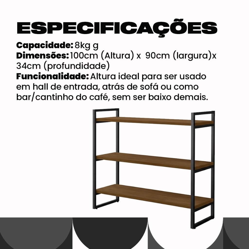 Aparador com 3 prateleiras estilo industrial decorativo, ideal para qualquer ambiente, deixando o espaço mais moderno e prático. Produto em aço carbono com pintura em pó e tampos em MDF com pintura UV. O estilo industrial remete aos típicos lofts de Nova York da década de 70, que aproveitavam a estrutura de antigas fábricas e galpões abandonados. A casa com decoração estilo industrial traz um pouco do charme urbano sem perder a elegância. Possui características que se conectam com a juventude e com a movimentação das cidades. É o Estilo que vem crescendo cada vez mais nos dias de hoje, nos dando a opção de fazer vários estilos e um único ambiente. Características: Nosso móvel é feito de Aço Carbono com pintura em pó. Contém pés niveladores Acabamento em ângulo na estrutura metálica Material tem acabamento impecável e cumpre com que promete. Contém 3 prateleiras com material de MDF de 15mm, com bordas acabadas de PVC na cor Imbuia. Peso suportado: até 8 kg por prateleira Dimensões: Altura: 100 cm Largura: 90 cm Profundidade: 34 cm Peso: 15 kg Garantia do Fornecedor: 3 Meses Observações: O material acompanha kit de parafusos e Manual de Montagem . É necessário que se tenha uma parafusadeira para obter melhor montagem.
