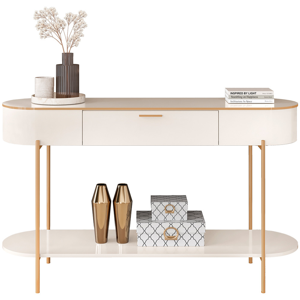 Transforme sua sala de estar em um refúgio de estilo e sofisticação com o Aparador Para Sala De Estar Orgânico Industrial Beca D05 Off White, da Lyam Decor. O design único com pés metálicos que evocam a robustez do estilo industrial, esse móvel é uma verdadeira obra de arte que combina o charme do contemporâneo com o orgânico. Seus cantos arredondados conferem suavidade, equilibrando a estética industrial com um conforto acolhedor. Além disso, esse aparador decorativo é equipado com uma prateleira espaçosa, uma solução prática para exibir suas decorações favoritas, livros ou plantas. Deixe sua criatividade fluir enquanto adiciona um toque pessoal ao seu espaço. O aparador oval é mais do que um simples móvel; é o toque final que sua sala merece. Redefina seu ambiente com elegância e funcionalidade! Adicione ao seu carrinho! Dimensões do produto (L x A x P) 135 x 80 x 39,2 cm. Medidas Internas Gaveta (L x P): 52,1 x 23,5 cm. Largura da parte interna da prateleira: 96,6 cm. Profundidade da prateleira: 35,4 cm. Altura do chão à prateleira: 15,1 cm. Altura entre prateleira e bancada: 47 cm. Características: Estrutura MDF/MDP. Peças na cor Off White com impressão ultravioleta e acabamento alto brilho. Tampo de 25mm usinado com bordas em pintura PU na cor dourada. 01 gaveta com corrediças telescópicas e puxador dourado. 01 prateleira inferior com cantos arredondados e acabamento das bordas em pintura PU. Pés metálicos cilíndricos na cor dourada, estilo industrial. Cantos arredondados, estilo orgânico. Suporta até 15 kg distribuídos. - Produto entregue desmontado, acompanha manual de montagem. Sistema de montagem: Parafusos, minifix e cavilhas. - Este produto deve ser limpo com pano macio e seco. Não utilize produtos abrasivos como álcool e detergente, assim como esponjas rígidas ou palha de aço. - Proteja a superfície do móvel de objetos que transmitam calor ou umidade. Observações importantes: - Produto para uso residencial em ambiente interno, não devendo ficar exposto diretamente ao sol, calor e umidade excessivos. - Pode haver alguma diferença de tonalidade entre a imagem e o produto real, por conta do tratamento de imagens e a calibração de cores do seu monitor. - As imagens são meramente ilustrativas, não acompanham objetos de decoração e eletrônicos. - Ao receber a mercadoria, o cliente deve verificar as condições da embalagem, caso haja alguma avaria não assine o comprovante de recebimento. - Montagem, desmontagem e outras instalações serão de responsabilidade do cliente. Não nos responsabilizamos, no ato da entrega, por subir escadas/elevadores ou pelo transporte por guincho em apartamentos. Eventuais despesas são de responsabilidade do comprador. - Confira as dimensões do produto e certifique-se de que passará normalmente por supostos elevadores, portas, escadas e/ou corredores de sua residência.
