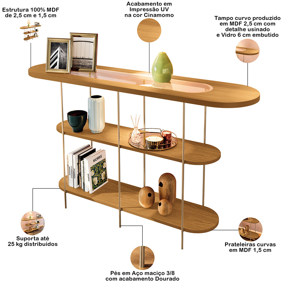 Com o Aparador Friesen, da Lyam Decor, você terá sofisticação e versatilidade em cada detalhe; afinal, é uma peça que redefine o conceito de elegância e funcionalidade, graças ao seu design orgânico e contemporâneo. Esse aparador decorativo é produzido com materiais nobres que garantem durabilidade e um acabamento impecável. A começar pelo tampo superior, com detalhe usinado e vidro embutido, que não apenas encanta os olhos, mas também proporciona uma superfície prática para exibir suas melhores peças decorativas. As prateleiras oferecem amplo espaço para livros, objetos e lembranças, permitindo que você crie uma composição única e pessoal. Já os pés em aço maciço com acabamento dourado conferem um toque de glamour, como também asseguram estabilidade e resistência ao móvel. Além de ser um elemento decorativo, esse aparador orgânico se destaca pela versatilidade, podendo atuar como um divisor de ambientes, trazendo harmonia e estilo a qualquer espaço. Então, aproveite hoje mesmo e transforme sua sala de estar com o Aparador Friesen e deixe sua marca de sofisticação em cada canto! Dimensões total do produto (L x A x P) 135 x 79 x 35 cm Características: Estrutura 100% MDF de 25mm e 15mm. Peças na cor Cinamomo com acabamento em impressão UV Texturizada. 02 prateleiras curvas em MDF 15mm, com amplo espaço para objetos decorativos, livros e outros itens. Tampo curvo produzido em MDF 25mm com detalhe usinado e vidro 6mm embutido. Pés em aço maciço 3/8 com acabamento dourado. Suporta até 25 kg distribuídos. - Produto entregue desmontado, acompanha manual de montagem. Sistema de montagem: Cavilhas, parafusos e girofix. - Este produto deve ser limpo com pano macio e seco. Não utilize produtos abrasivos como álcool e detergente, assim como esponjas rígidas ou palha de aço. - Proteja a superfície do móvel de objetos que transmitam calor ou umidade. Observações importantes: - Produto para uso residencial em ambiente interno, não devendo ficar exposto diretamente ao sol, calor e umidade excessivos. - Pode haver alguma diferença de tonalidade entre a imagem e o produto real, por conta do tratamento de imagens e a calibração de cores do seu monitor. - As imagens são meramente ilustrativas, não acompanham objetos de decoração e eletrônicos. - Ao receber a mercadoria, o cliente deve verificar as condições da embalagem, caso haja alguma avaria não assine o comprovante de recebimento. - Montagem, desmontagem e outras instalações serão de responsabilidade do cliente. Não nos responsabilizamos, no ato da entrega, por subir escadas/elevadores ou pelo transporte por guincho em apartamentos. Eventuais despesas são de responsabilidade do comprador. - Confira as dimensões do produto e certifique-se de que passará normalmente por supostos elevadores, portas, escadas e/ou corredores de sua residência.