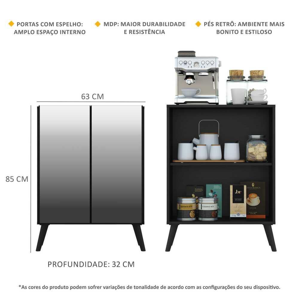 O Aparador Cantinho do Café com Espelho e Pés Retrô 2 Portas Multimóveis é produzido em MDP com acabamento acetinado (cerca de 20% de brilho), que garante maior durabilidade, facilidade na limpeza, além de um acabamento superior. Com 2 portas, possui um excelente espaço interno para organizar louças, bebidas e demais objetos (a prateleira interna suporta 8 Kg e o tampo 9 Kg). Os pés retrô, em polipropileno, dão um charme especial ao móvel deixando-o com um visual leve e permitindo você compor um ambiente com ar vintage e moderno ao mesmo tempo. Os detalhes com espelhos nas portas deixam o móvel mais requintado, e charmoso. Os espelhos são de vidro (o que evita que a imagem fique distorcida) e lapidados, ou seja, passam por um processo para que as bordas não fiquem cortantes, o que garante maior segurança. Os amantes de café poderão deixar seu cantinho mais prático e aconchegante para curtir os melhores momentos com os amigos e família, saboreando um delicioso cafezinho. Conteúdo da Embalagem: 1 (um) aparador 1 (um) kit com 4 pés retrô 1 (um) kit com 2 espelhos Dimensões do produto montado: Altura: 85cm | Largura: 63cm | Profundidade: 32cm *Você pode consultar as medidas internas na imagem técnica do produto. Cores Disponíveis: Branco - Branco/Preto - Branco/Natural - Preto Texturizado - Preto Texturizado/Branco - Preto Texturizado/Natural - Rustic/Branco - Rustic/Preto - Rustic/Natural *As cores do produto podem sofrer variações de tonalidade de acordo com as configurações do seu dispositivo. Imagem meramente ilustrativa. Decoração e eletros não acompanham o produto. O produto será entregue desmontado e não disponibilizamos o serviço de montagem.
