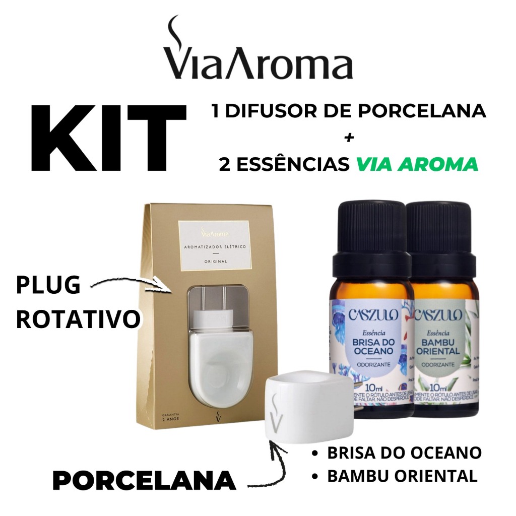 Kit Difusor Aromatizador Porcelana Elétrico Original Branco com 2 Essências - Via Aroma Obs: Na variação “Essência a Escolher” o cliente deve socilitar a essência na observação do pedido e confirmar se esta disponível através do nosso chat. As essências Via Aroma possuem grande qualidade e variedade, são mais de cinquenta aromas divididos em sete famílias olfativas. A embalagem do produto é de vidro cor âmbar para proteger o conteúdo, o rótulo informa o aroma, e cada aroma possui uma cor e uma estampa específica. Para uso no aromatizador elétrico utilize 15 gotas para aproximadamente 4 horas de aromatização, em um ambiente de 30m².