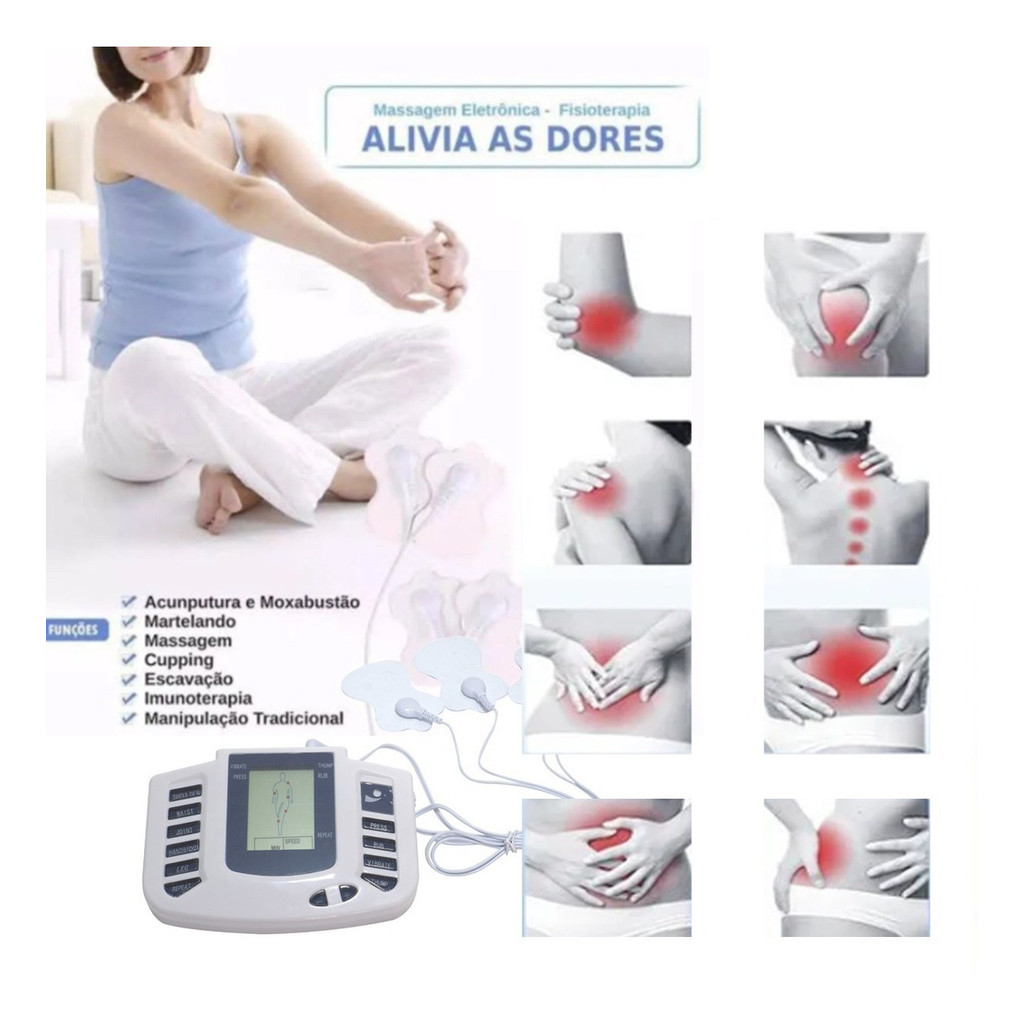 Máquina de terapia eletroestimulação, indicado para aliviar dores e estresse sem o uso de medicamentos. ***O aparelho possui função de desligamento automático, caso não esteja em uso ou esteja conectado de forma errada. Caso não saiba usar solicite instruções antes de abrir reclamação. *** Principais funções e indicações: redução de dores, imunoterapia, estresse, aliviar dores ocasionadas por doenças crônicas, dentre outras funções. Aparelho que traz os inúmeros benefícios da medicina chinesa, por exemplo, no alívio de estresse, tensão pré menstrual, melhoras de quadros de insônia, controle e gerenciamento das emoções entre outros. Atenção! Produto testado antes do envio, caso não saiba usar solicite instruções. Atributos: > Aparelho de fácil uso >Ajuste de intensidade > Acompanha eletrodos necessário para uso > Produto com regulagem de potência, indicado usar com cautela > Pode ser utilizado com 2 ou 4 eletrodos ao mesmo tempo > Opera em diversas funções programáveis e pode utilizar as opções pré-configuradas para cada parte do corpo - Potência: 2.5 W - Frequência: 1-50Hz Atenção: Equipamento contra indicado para gestantes, lactantes, pessoas que usam marca-passo, problemas cardíacos. ACOMPANHA: 1x Aparelho de fisioterapia tens na cor Branca 4x Adesivos de contato Eletrodos (2 pares) 1x Cabo de 04 saídas para tratamento 1x Cabo de 02 saídas para tratamento 1x Cabo de alimentação Bivolt 1x FONTE Bivolt 1X Apoio para Eletrodo 1x Manual em Português + BRINDE 4 ELETRODOS