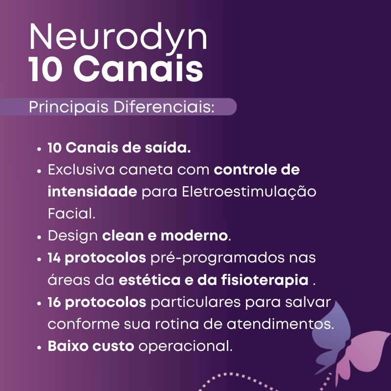 Neurodyn 10 Canais - Aparelho de Eletroestimulação Ibramed O Neurodyn 10 Canais é uma plataforma completa com as correntes Russa, Aussie, Microcorrente e Eletrolipólise. Possui 10 canais de saída para aplicação direta via eletrodos, com controles de intensidades independentes, isto é, cada canal possui um controle individual da intensidade, que podem ser utilizados tanto no modo contínuo, sincrônico, recíproco, desobstrução ou sequencial. O Neurodyn 10 Canais é um equipamento de simples operação que possibilita múltiplas opções de tratamentos faciais e corporais. Versátil, o Neurodyn 10 Canais foi desenvolvido pensando na necessidade do profissional que trabalha nas diferentes áreas da estética, da medicina, da fisioterapia e da reabilitação. Com design diferenciado e teclas soft touch, o Novo Neurodyn 10 Canais acompanha uma caneta exclusiva para eletroestimulação facial, com controle da intensidade. Além de contar com 14 protocolos de tratamentos pré-programados e 20 particulares, onde o usuário pode programar e salvar na memória do equipamento, a fim de otimizar seus atendimentos. DIFERENCIAIS E BENEFÍCIOS - 10 canais de saída com controles independentes de intensidade para maiores áreas de tratamento ou mais áreas tratadas simultaneamente. - Modo contínuo, sincrônico, recíproco, desobstrução e sequencial. - Novo design elegante com teclas sotf touch. - Exclusiva caneta para eletroestimulação facial. - 14 protocolos pré-programados e 20 particulares. - Possibilita múltiplos tratamentos faciais e corporais em diferentes áreas da estética e da reabilitação física. INDICAÇÕES - Drenagem linfática - Flacidez muscular - Contraturas musculares - Dores - Celulite - Fibroses e aderências - Gordura localizada - Fortalecimento muscular - Recuperação funcional - Pré e pós-operatório - Nutrição tecidual - Cicatrização - Equilíbrio do Ph - Estímulo da circulação sanguínea - Eletrolipólise - Estimulação de pontos - Tonificação de pontos EFEITOS FISIOLÓGICOS: RUSSA - Melhora do metabolismo celular, aumento da oxigenação. - Dilatação arterial e irrigação sanguínea, aumento do tônus e força muscular. - Despolarização do neurônio motor produzindo contração eficiente no músculo. - Tonificação e fortalecimento muscular. - Liberação de metabólitos. AUSSIE - Melhora da vascularização. - Tonificação e fortalecimento muscular. - Melhora do tecido conjuntivo devido à eliminação dos detritos toxêmicos. - Melhora da circulação linfática, eliminando as toxinas. - Melhora do aporte de enzimas e nutrientes na corrente sanguínea. - Aumento de flexibilidade Tissular. ELETROLIPÓLISE - Estimulação do sistema nervoso simpático que libera hormônios adrenalina e noradrenalina. - Ativação da enzima triglicerídea lípase sensível a hormônio, a qual hidrolisa os triagliceróis. - Liberação de glicerol e ácidos graxos. DADOS TÉCNICOS - Neurodyn 10 Canais Ibramed - Registro Anvisa: 10360310023 - Canais de saída: 10 canais - Pulso: Até 400 us - Frequência: 1 a 120Hz - Intensidade: de 0 a 140 mA - Voltagem: Bivolt Automático (110/220V) - Garantia: 18 meses - Dimensões (C X L X A): 36,5 x 31,5 x 12,5 cm - Peso: 2,5 kg ITENS INCLUSOS 01 Neurodyn 10 Canais - Ibramed 01 Cabo duplo laranja e preto 01 Cabo duplo azul e verde 01 Cabo duplo cinza e rosa 01 Cabo duplo branco e amarelo 01 Cabo duplo marrom e roxo 01 Cabo com caneta facial 10 Garras jacaré pretas 10 Garras jacaré vermelhas 20 Eletrodos condutivos pretos de 8 x 7,5cm 02 Eletrodos condutivos faciais de 3 x 9 x 5 x 10 cm 02 Eletrodos condutivos faciais de 3 x 9 x 5 x 15 cm 10 Cintas elásticas para fixação de eletrodos 01 Bisnaga de gel – 100g 10 Pacotes com 10 agulhas cada de 0,25 mm x 50 mm 01 Cabo de energia 01 Fusível de proteção APROVEITE! OFERTA POR TEMPO LIMITADO! DÚVIDAS? FAÇA SUA PERGUNTA ABAIXO! SERÁ UM PRAZER LHE ATENDER!