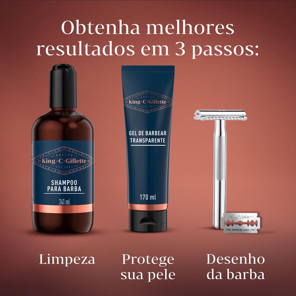 O Aparelho de Barbear Clássico de Aço Inoxidável King C. Gillette com seu cabo cromado de alta qualidade e lâminas de barbear revestidas de platino proporciona precisão ao delinear sua barba e a melhor tecnologia para uma maior duração do aparelho. • OS CLÁSSICOS NÃO SAEM DE MODA: com seu aparelho de barbear clássico, cromado de alta qualidade e lâminas de barbear revestidas de platina, consegue precisão ao delinear sua barba e a melhor tecnologia para uma maior duração do aparelho • BARBEAR MAIS CONFORTÁVEL: oferece um corte preciso e suave. • CABO PREMIUM: o cabo de aço inoxidável cromado oferece maior controle e precisão ao delinear sua barba. Com revestimento antifricção para obter um barbear mais confortável. • CONTÉM: um aparelho de barbear clássico King C. Gillette e 5 lâminas de barbear duplo fio com platina. • MELHOR EXPERIÊNCIA: com a nova linha de produtos para o cuidado da barba de King C. Gillette, sinta o melhor da sua barba