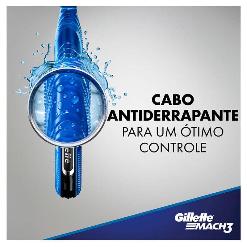 O aparelho de barbear recarregável Gillette Mach3 agora com um cabo 360° Aqua-Grip para controle total, mesmo úmido. Possui três lâminas mais afiadas que oferecem até 20 vezes um barbear suave; com uma fita lubrificante que ajuda a proteger a pele contra irritações e cabeça móvel que se ajustam aos contornos do rosto para um barbear confortável e nivelado. Seu cabo antiderrapante lhe dará um ótimo controle no chuveiro. - Controle total: Cabo Antiderrapante para um ótimo controle até quando estiver molhado; - Barbear mais rente: Três (3) Lâminas mais resistentes que o aço e se mantêm afiadas por mais tempo; - Menos irritação: Sua fita lubrificante ajuda a conseguir uma barba com menos irritação; - Mais economia: Dura até 2 vezes mais do que a descartaveis de 3 laminas lider* (*vs. Prestobarba3); - Cabeça móvel: Se adapta ao contorno da sua pele; - Protege sua pele: 10 microtensores que esticam a pele para um barbear mais rente.