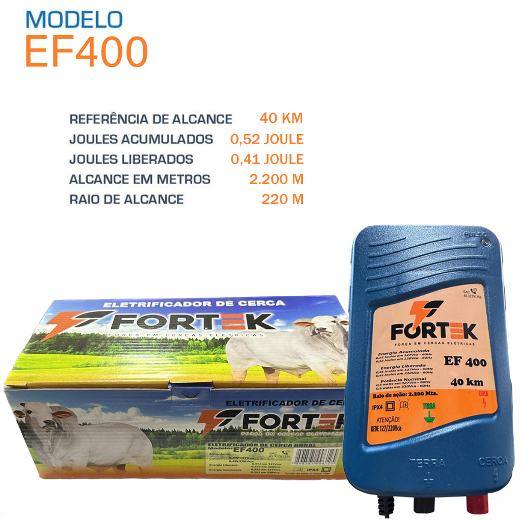 ENVIAMOS NO MESMO DIA EM COMPRAS ATÉ 11 HORAS EM DIAS ÚTEIS ITENS DO KIT 1 ELETRIFICADOR FORTEK EF400 40 KM - Energia acumulada - 0,52 joules - Energia liberada -0,41 joules - Potência nominal - 0,5 watts em 127v - 60hz / 0,6 watts em 220v - 60hz - Raio de ação - 2.200 metros / Até 40km de cerca As vantagens de se ter uma cerca elétrica residencial, industrial ou rural incluem: Segurança efetiva com a dissuasão de intrusos, proteção de propriedade e pessoas, detecção de tentativas de invasão, facilidade de instalação, BAIXO CUSTO E MANUTENÇÃO, operação 24 horas por dia, resistência a condições climáticas adversas, flexibilidade de configuração, compatibilidade com sistemas de segurança adicionais e controle de acesso. Além destes, a cerca elétrica além de prevenção contra animais invasores que podem tentar adentrar sua residência, estabelecimento comercial ou sua propriedade rural, podendo causar prejuízos de variados tipos, ela também educa o seu próprio animal, sendo ele um pet de pequeno porte, ou até mesmo animais de fazendas de médio e grande porte, como ovinos e gado nelore, entre outros. A cerca terá a função de educar este animal, a não tentar mais ultrapassar o limite imposto pela cerca, pois após várias tentativas de ultrapassagem o animal for repelido, ele vai entender que ali é o seu limite, e que há algo ali que o repele e assim com o tempo, somente de visualizar a cerca não encoste mais caso chegue muito próximo, já sabendo que será repelido. Não há efeitos colaterais no animal de grande ou pequeno porte (excluindo os que apresentam idade avançada ou recém nascidos, e ou algum problema cardíaco), o choque como dito gera uma barreira psicológica no animal. Recomendações de Uso e Instalação * Ao realizar a escolha do eletrificador é fundamental considerar uma margem de reserva de energia para ter a máxima segurança na sua instalação e funcionamento, assim como facilitar a possibilidade de futura ampliação da área A capacidade do energizador deve superar amplamente o comprimento (Metros Lineares) da cerca elétrica a construir. * O alcance dos eletrificadores estimado em Km vária com a umidade do solo, crescimento da vegetação e contato com o arame, construção da cerca, diâmetro dos arames, aterramento, etc. * As cercas elétricas comparadas às convencionais exigem mão-de-obra qualificada para a construção, execução de reparos e manejo, e vistorias mais frequentes para detecção de possíveis falhas no sistema e controle do crescimento da vegetação sob a cerca. * Assegure ? se sempre de que está seguindo todas as regras e padrões de segurança para cercas elétricas. Em caso de dúvida, sempre consulte um técnico especializado. Orientação de Instalação * Antes de instalar o seu aparelho, leia o manual de instruções que você terá o melhor resultado na eletrificação de sua cerca. * Procure um lugar onde o aparelho fique abrigado do sol e da chuva, se for fora do galpão é indicado construir um abrigo. * Fazer aterramento com haste de cobre ou cano galvanizado de no mínimo 2 metros para aparelhos de até 30Km, caso for maior que 30Km usar 2 a 3 hastes de 2 metros ou mais, distantes de 3 metros uma da outra, ambos têm que ser um lugar úmido, caso o lugar não possua umidade e recomendado colocar no buraco junto com a haste carvão com sal, para criar a umidade. * Conectar o terminal carga do eletrificador na cerca elétrica usando arame ou fio de cobre. * Conectar o terminal terra haste ou tubo do aterramento, usando um arame, fio de cobre. * Ligar o eletrificador na rede elétrica e está pronto para uso. Possíveis Causas de um Sistema Pouco Eficiente: * Insuficiente número de barras de aterramento * Conexões ineficientes com arames de deferentes metais * Má conexão entre as barras de aterramento * Barras de aterramento muito curtas. * Barras de aterramento muito próximas uma da outra.