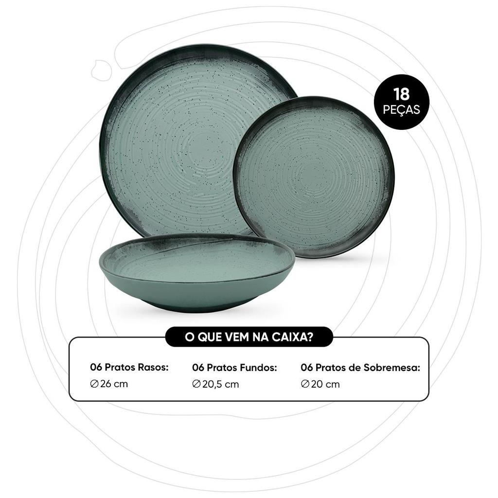 Inspirados na vertente do design biofílico que busca conectar as pessoas com os benefícios da presença da natureza em ambientes e na criação de produtos, apresentamos a coleção Flat. Com inspiração natural, trazemos seus elementos mais representativos para um dia a dia mais tranquilo e repleto de bem-estar.Os pratos da linha Flat oferecem uma área maior de uso tornando-se uma opção adequada para empratamentos criativos, além de proporcionarem mais conforto na hora de usar. Com formas retas e funcionais, as peças da linha são fáceis de armazenar até mesmo em armários mais compactos. Com inspiração na natureza, a decoração Pacífico possui acabamento acetinado, a cor azul ao centro e extremidades na cor preta gradiente. O alto relevo é aplicado em todo o prato imitando o movimento das águas quando um objeto atinge a sua superfície, inspirando paz e serenidade. Conteúdo da embalagem: 6 Pratos Rasos 26Cm, 6 Pratos Fundos 20,5 Cm, 6 Pratos Sobremesa 20Cm - Garantia: 3 Meses para Defeitos de fabricação - Marca: Oxford - Tipo da embalagem: Caixa litografada - Material: Cerâmica - Cor: Verde - Decoração: Monocromático - Formato: Redondo - Tipo do jogo: Jantar e almoço - Linha: Flat - Modelo: Flat Pacífico - Quantidade de peças: 18 - É kit de fábrica: Sim - É apto para lava-louças: Sim - É Apto para microondas: Sim ATENÇÃO: Para compras de pessoa jurídica,cadastreosdados exatamente como consta em seu cartão do CNPJ