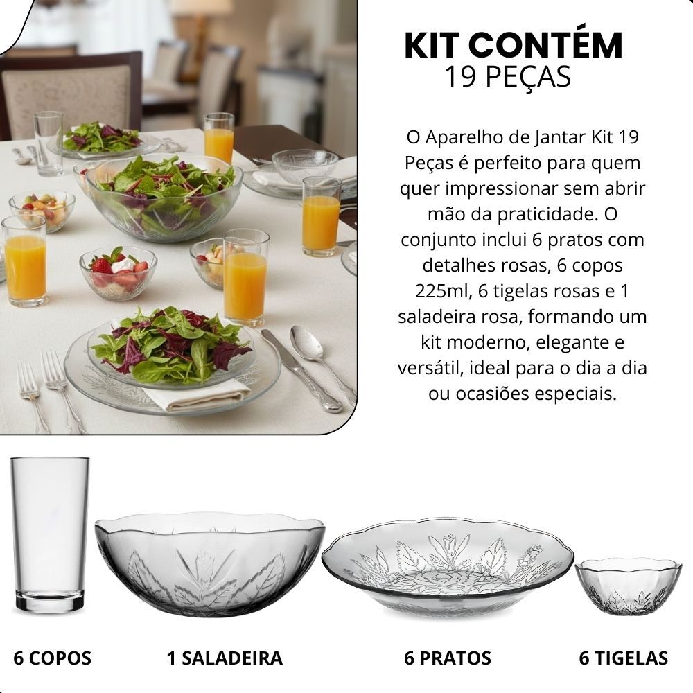 Aparelho de Jantar Kit 19 Peças – Sofisticação e Praticidade para sua Mesa O Aparelho de Jantar Kit 19 Peças é perfeito para quem quer impressionar sem abrir mão da praticidade. O conjunto inclui 6 pratos com detalhes rosas, 6 copos 225ml, 6 tigelas rosas e 1 saladeira rosa, formando um kit moderno, elegante e versátil, ideal para o dia a dia ou ocasiões especiais. Produzido em vidro transparente, o kit oferece leveza, resistência e acabamento impecável. Seu design sofisticado valoriza cada refeição e deixa sua mesa muito mais bonita e organizada. Se você busca qualidade, durabilidade e um visual que chama atenção, este kit é a escolha certa. Vantagens: Peças em vidro transparente, delicadas e elegantes; Tamanho ideal para servir suas refeições com praticidade; Design simples, moderno e diferenciado, que valoriza qualquer mesa. Contém: 6 Pratos Detalhes Rosas 6 Copos Ohio 225ml 6 Tigelas sobremesa 1 Saladeira Informações Técnicas (aproximadas por unidade): Pratos: 21,5 cm de diâmetro | 3 cm de altura | 15 cm base | 3 mm de espessura Copos: 225 ml | 12 cm de altura | 6,4 cm diâmetro da Boca | 5,0 Base Saladeira: 1.5L | 22 cm de diâmetro | 7,5 cm de altura | 12,0 Base Sobremesa: 250ml | 12,5 cm de diâmetro | 5,5 cm de altura | 7,0 Base Composição: Vidro Cor: Transparente Validade: Indeterminada Cuidados: Não utilizar produtos abrasivos ou palha de aço; Lavar com detergente neutro e lado macio da esponja; Produto sensível a quedas; Manter fora do alcance de crianças; Uso incorreto pode reduzir a vida útil do produto. Garanta já o seu Kit 19 Peças e transforme suas refeições em momentos especiais! Imagens meramente ilustrativas.