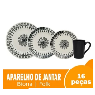 Contéudo da Embalagem: 4 Pratos Rasos - 24cm 4 Pratos Fundos - 21,5cm 4 Pratos Sobremesa - 18cm 4 Canecas Tall - 230ml Características do Produto: Marca: Biona Cor: Preto e estampado Material: Cerâmica Linha do Produto: Folk Características Adicionais: A caneca preta é sem decoração. Os pratos são todos decorados. Vai ao micro ondas, na lava louças. Não é permitido usar em fornos. Fornecedor: Oxford Porcelanas S/A
