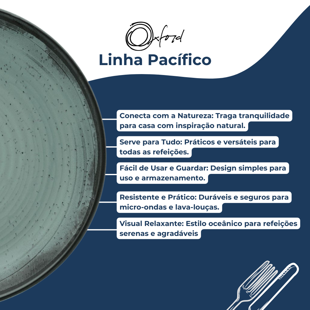 SOBRE O PRODUTO Inspirados na vertente do design biofílico que busca conectar as pessoas com os benefícios da presença da natureza em ambientes e na criação de produtos, apresentamos a coleção Flat. Com inspiração natural, trazemos seus elementos mais representativos para um dia a dia mais tranquilo e repleto de bem-estar. Os pratos da linha Flat oferecem uma área maior de uso tornando-se uma opção adequada para empratamentos criativos, além de proporcionarem mais conforto na hora de usar. Com formas retas e funcionais, as peças da linha são fáceis de armazenar até mesmo em armários mais compactos. Com inspiração na natureza, a decoração Pacífico possui acabamento acetinado, a cor azul ao centro e extremidades na cor preta gradiente. O alto relevo é aplicado em todo o prato imitando o movimento das águas quando um objeto atinge a sua superfície, inspirando paz e serenidade. CONTEÚDO DA EMBALAGEM 4 Pratos Rasos Flat 26cm 4 Pratos Sobremesa Flat 20cm 4 Pratos Fundos 20,5 4 xícaras de 200ml com pires ESPECIFICAÇÕES Material: Cerâmica Uso: Resistente a micro-ondas, Resistente a lava-louças Decoração: Flat Pacífico Cor: Azul Turquesa, Verde Água