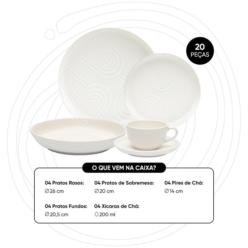 Os pratos da linha Flat não possuem abas e oferecem uma área maior de uso para empratamentos criativos. As peças possuem formatos retos e funcionais, podendo ser facilmente armazenadas em espaços compactos. A decoração Zen combina detalhes em alto relevo e toque acetinado. O branco essencial do acervo de louças ganha uma tonalidade off-white com acabamento texturizado nessa proposta. Conteúdo da embalagem: 4 Pratos Rasos 26 Cm, 4 Pratos Fundos 20,5 Cm, 4 Pratos Para Sobremesa 20 Cm, 4 Xícaras De Chá 200 Ml Com Pires 14 Cm - Garantia: 3 meses para defeitos de fabricação - Marca: Oxford - Tipo de embalagem: Caixa litografada - Linha: Plana - Formato de Venda: Kit - Cor: Branco - Forma: Redondo - É apto para lava-louças: Sim - Linha/Decoração: Flat - Modelo: Flat Zen - Unidades por kit: 20 - Material: Cerâmica - Decoração: Monocromático - Tipo de jogo: Jantar e Almoço - Uso: Resistente a micro-ondas, Resistente a lava-louças - É Apto para micro-ondas: Sim - Quantidade de peças: 20 - É kit: Sim - Condição do item: Novo - Código universal de produto: 7891361441648 ATENÇÃO: Para compras de pessoa jurídica, cadastre os dados exatamente como constam em seu cartão do CNPJ
