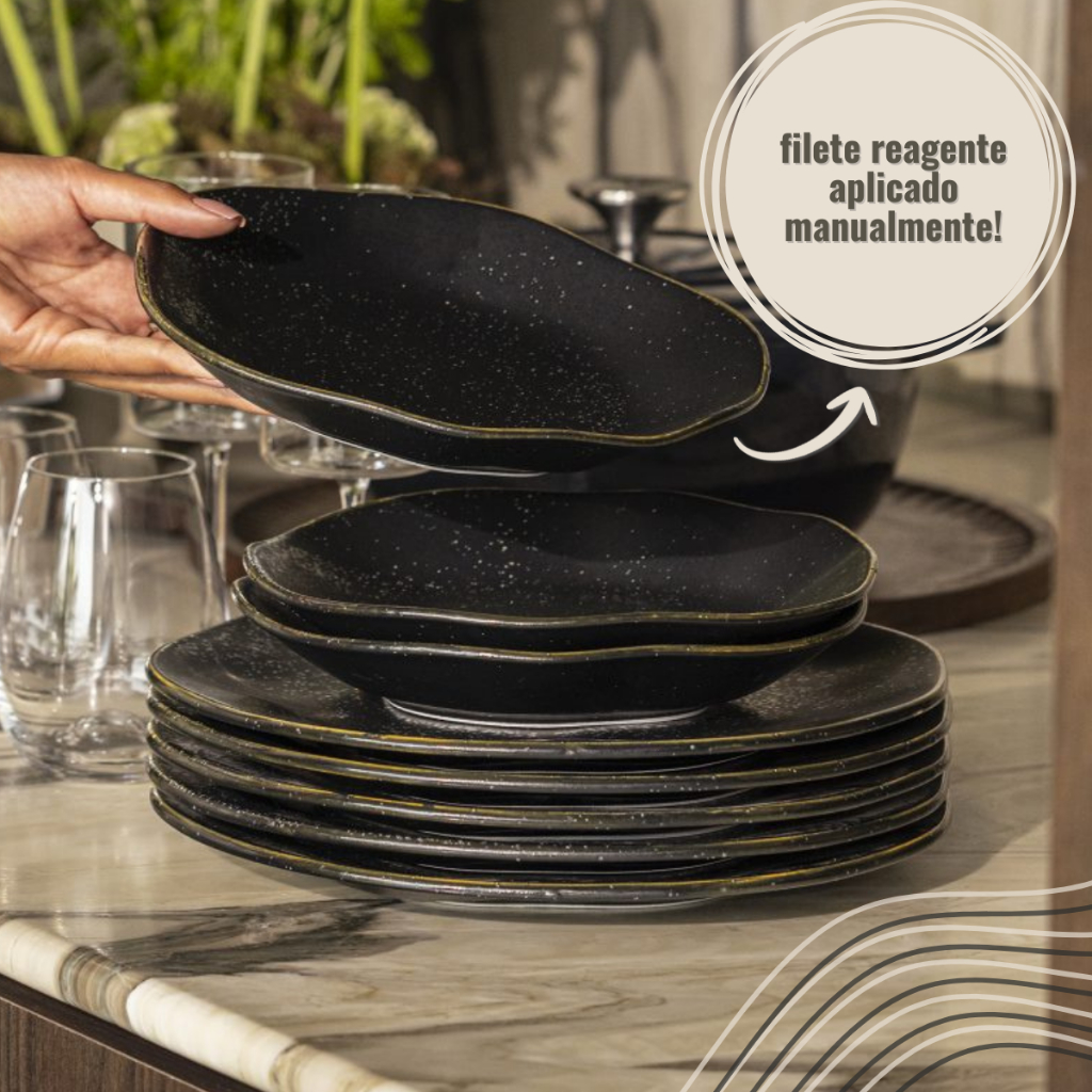 SOBRE O PRODUTO O orgânico shape Ryo, valoriza a fluidez e a beleza do imperfeito, assim como propõe a filosofia japonesa Wabi-sabi. Dialogando com tendências que buscam a conexão com a natureza, as novas decorações da linha celebram a dualidade dos elementos de fogo e água. Com acabamento acetinado, a decoração Volcano captura a essência das chamas e da transição do fogo em brasa com o imponente preto fosco. As bordas orgânicas recebem um filete reagente de tonalidade ocre. O aparelho de jantar 20 peças atende uma mesa posta completa para 4 pessoas com pratos rasos, fundos, sobremesa, xícaras e pires. CUIDADOS - Peças com acabamento acetinado podem apresentar marcas superficiais de uso. Para removê-las, recomenda-se a limpeza com o lado abrasivo da esponja, com movimentos suaves e detergente neutro. CONTEÚDO DA EMBALAGEM 4 pratos rasos 27,5 cm de diâmetro 4 pratos fundos 22,5 cm de diâmetro e 4,5 cm de altura 4 pratos de sobremesa 21,5 cm de diâmetro 4 xícaras de chá 220 ml com pires 16 cm ESPECIFICAÇÕES TÉCNICAS Uso: Resistente a micro-ondas, Resistente a lava-louças Cor: Preto Material: Porcelana Linha/Decoração: Ryo Volcano Conjunto ou avulso: Conjunto Formato: Redondo