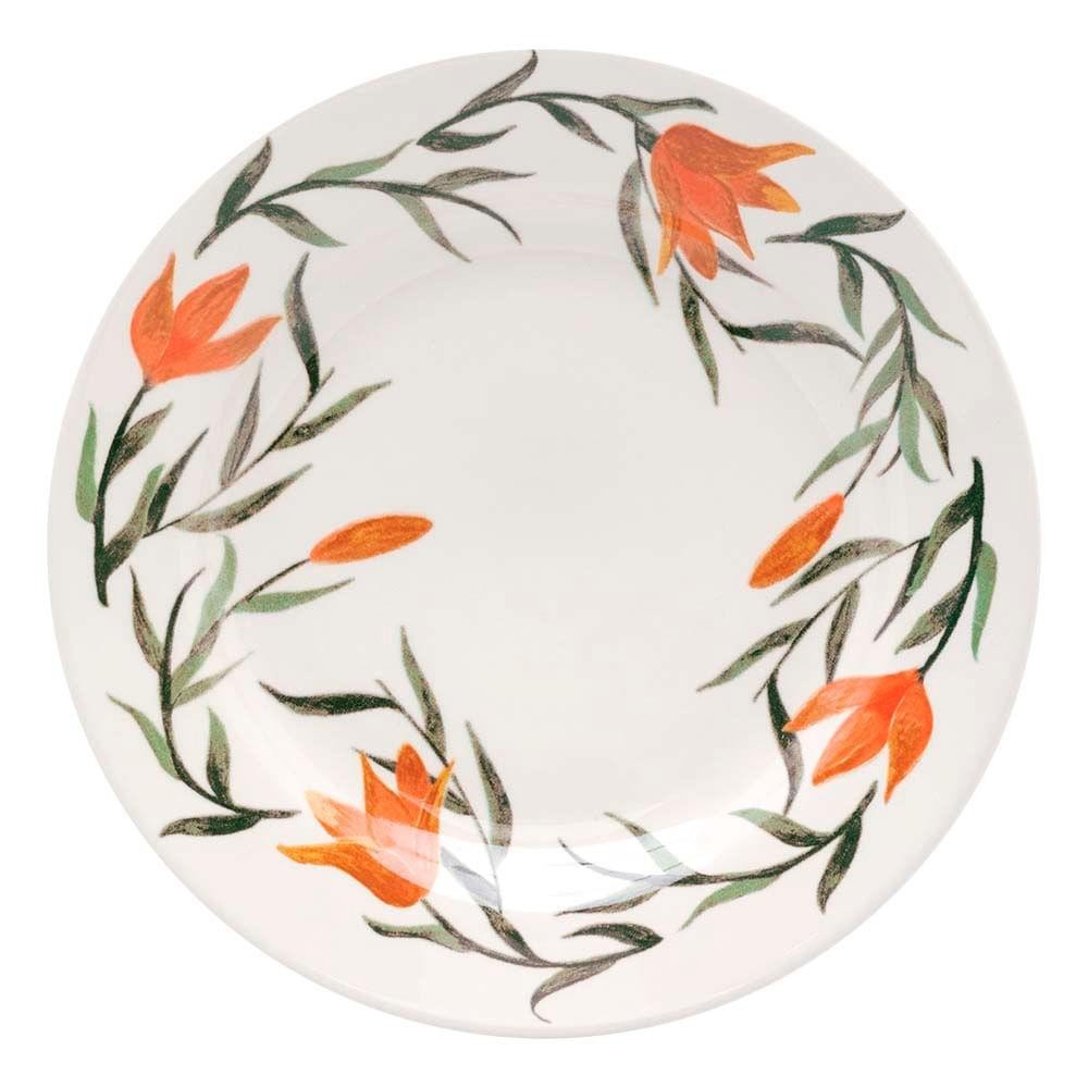 Os lírios são uma das flores mais comuns em jardins e casas brasileiras. Na coleção Donna Lírios, ele vira a estrela principal da decoração. As bordas de cada borda e pires recebem o desenho feito à mão da flor de cor laranja junto de ramos e folhas. As cores são vibrantes e trazem alegria à mesa. A xícara é esmaltada em laranja. O aparelho de jantar de 30 peças compõe uma mesa para 6 pessoas. Conteúdo da Embalagem: 6 Pratos Rasos 24cm Biona Donna Lírios, Cerâmica - 126274 6 Pratos Fundos 21,5cm Biona Donna Lírios, Cerâmica - 126275 6 Pratos Lanche 18cm Biona Donna Lírios, Cerâmica - 126276 6 Xícaras de Chá Biona Donna Lírios 200ml, Cerâmica - 126278 6 Pires Biona Donna Lírios, Cerâmica - 126278