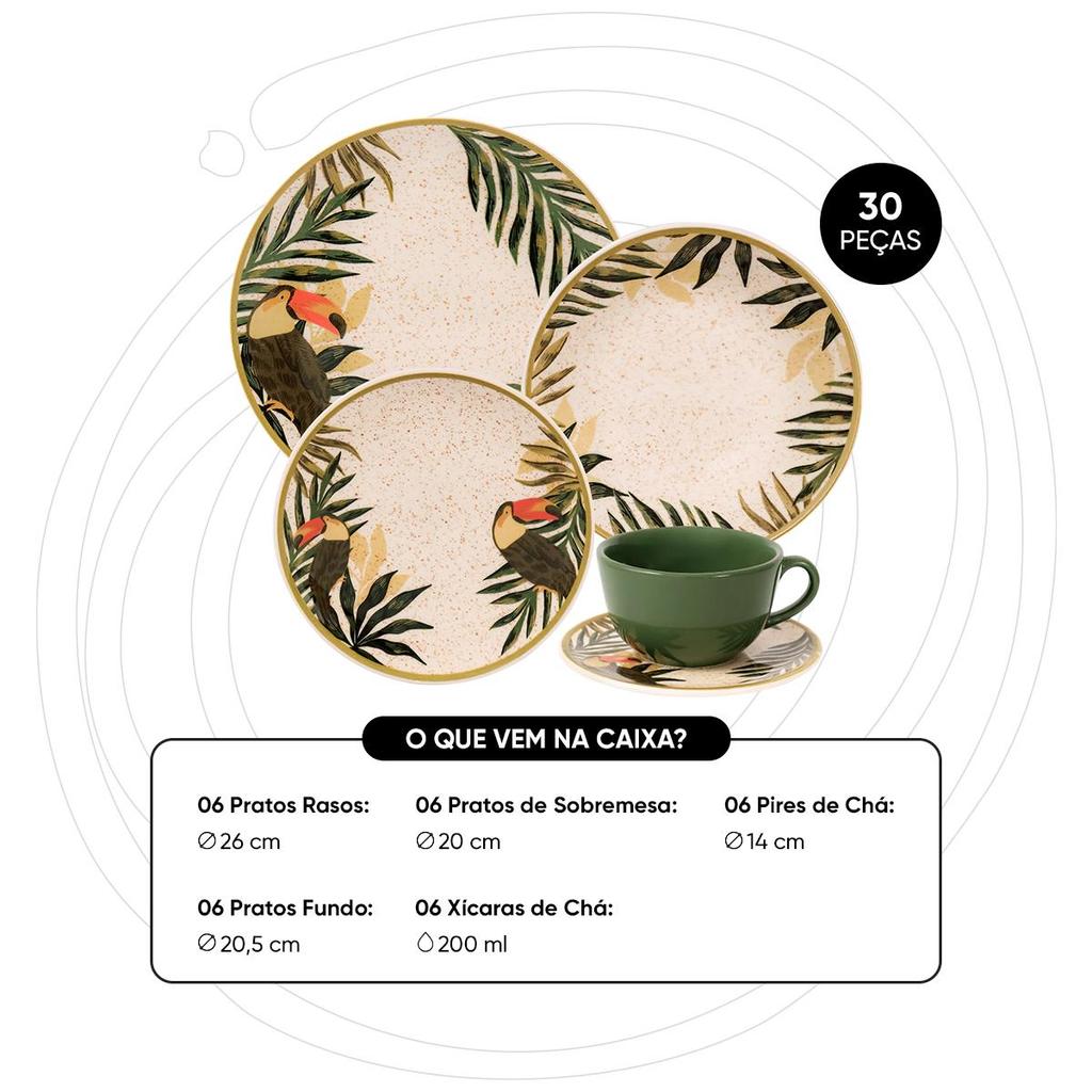 Trazendo a vibração e a exuberância das paisagens tropicais, a decoração Tropicano traz o tucano em destaque em meio a folhagens fluídas estampando os pratos de formato minimalista do modelo Unni. Os pratos têm o acabamento de granilha e filete na borda de cada peça. O conjunto é a escolha perfeita para quem valoriza beleza natural, funcionalidade e um toque de sofisticação tropical. O aparelho de jantar 30 peças é composto por 6 pratos rasos, 6 pratos de sobremesa, 6 pratos fundos e 6 xícaras de chá com pires. Serve uma mesa completa para 6 pessoas. Conteúdo da embalagem: 06 Pratos Rasos 26 cm (diâmetro), 06 Pratos Fundos 20,5 cm (diâmetro), 06 Pratos Sobremesa 20 cm (diâmetro), 06 Xícaras de Chá 200 ml (capacidade), 06 Pires de Chá 14,5 cm (diâmetro). - Garantia: 3 Meses para Defeitos de fabricação - Marca: Oxford - Material: Cerâmica - Cor: Multicor - Formato: Redondo - Decoração: Estampado - Formato de venda: Conjunto - Modelo: Unni Tropicano - Tipo da embalagem: Caixa litografada - Uso: Resistente a micro-ondas - Quantidade de peças: 30 - Tipo do jogo: Aparelho de jantar - É kit de fábrica: Sim - É kit: Sim - É apto para lava-louças: Sim - Condição do item: Novo - Linha: Tropicano ATENÇÃO: Para compras de pessoa jurídica,cadastreosdados exatamente como consta em seu cartão do CNPJ