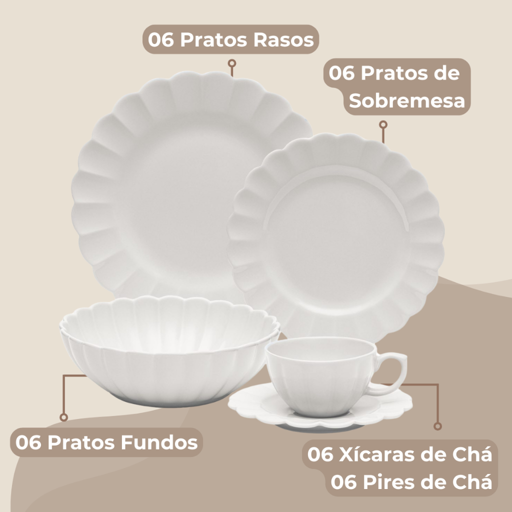 SOBRE O PRODUTO Encante-se pela beleza das flores, traduzida em uma nova linha de porcelanas da Oxford. Batizada Flora, a linha apresenta pratos de espessura finíssima e design de aba larga, decorada com vincos em alto-relevo inspirados nas pétalas das flores. Na decoração Camélia, torna-se uma opção atemporal e elegante em off-white. O aparelho de jantar 30 peças atende uma mesa posta completa para 6 pessoas com pratos rasos, fundos, sobremesa, xícaras e pires. CONTEÚDO DA EMBALAGEM 6 pratos rasos 27,5 cm 6 pratos fundos 20 cm 6 pratos de sobremesa 22 cm 6 xícaras 220 ml 6 pires 16 cm ESPECIFICAÇÕES TÉCNICAS Uso: Resistente a micro-ondas, Resistente a lava-louças Cor: Branco Material: Porcelana Linha/Decoração: Flora Camélia Conjunto ou avulso: Conjunto Formato: Redondo