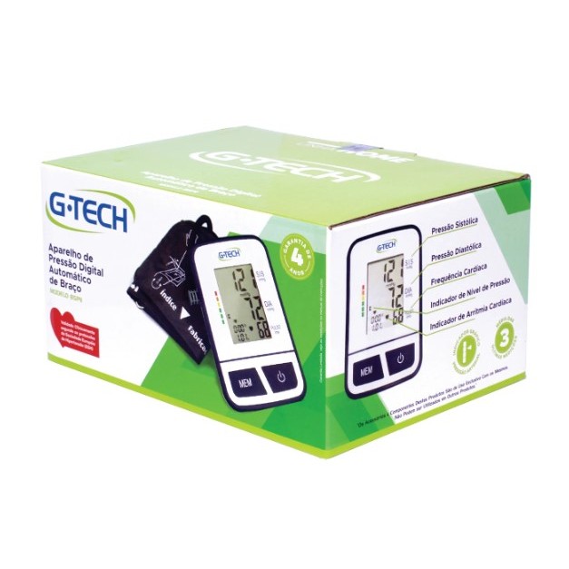 Aparelho de Pressão Digital Automático de Braço BSPII G-Tech 7898639690388 G-TECH O novo medidor de pressão arterial da G-Tech é uma solução completa para quem faz o acompanhamento da pressão. Além das medições tradicionais de pressão arterial e frequência cardíaca, possui uma série de outros benefícios, como: Memória para 120 resultados, indicador de arritmia cardíaca, indicador gráfico de nível de hipertensão e o cálculo da média automática das três últimas medições. Todas essas funções permitem um acompanhamento completo dos níveis de pressão arterial, sempre contando com a qualidade e segurança da marca, que oferece uma garantia de 4 anos, assegurando tranquilidade por um período estendido. O modelo BSP11 é digital, possui inflagem automática e é indicado para utilização no braço.