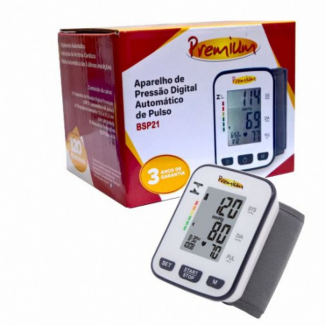 O Aparelho de pressão digital de pulso Premium BPSP21 é um equipamento prático para medição dos níveis de Pressão Arterial. É uma importante ferramenta no controle e avaliação do tratamento, pois possui diversas funções além de medir a pressão arterial, como: Indicador de Arritmia cardíaca, média automática das três últimas medições, gráfico indicador de nível de hipertensão e 120 posições de memória para até 3 usuários, permitindo separar as medições e facilitar a releitura dos dados armazenados. É validado clinicamente e possui 3 anos de garantia. 1- Aprovado pelo Inmetro; 2- 3 (três) anos de garantia de fabrica; 3- Indicador de arritmia cardíaca; 4- Média automática das 3 (três) últimas medições; 5- Indicador gráfico de nível de hipertensão; 6- Memória para 120 resultados com hora e data; 7- Totalmente automático; 8- Medidor de pressão e pulsação; 9- Medição no pulso; 10- Acompanha pilhas.