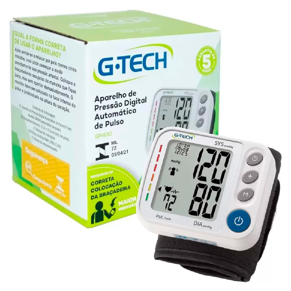 O que é Aparelho de Pressão G-Tech Automático Pulso GP400? O Aparelho de Pressão G-Tech Automático Pulso GP400 é um aparelho digital automático criado para medir a pressão arterial e a frequência card