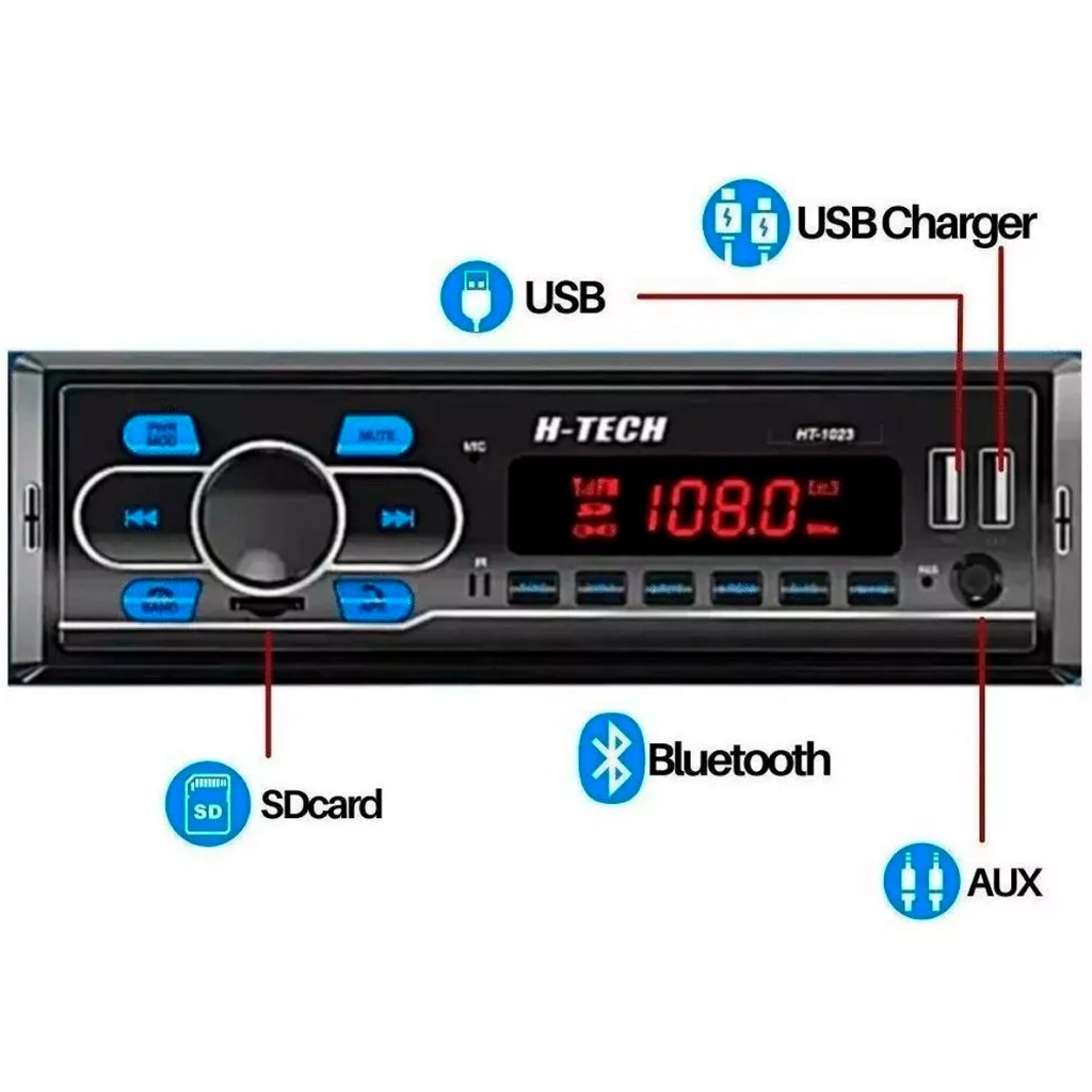 Rádio MP3 Player Automotivo H-TECH HT-1023 USB/SD/AUX/Bluetooth Seu design moderno vai ocupar o painel do seu carro com muito estilo. Reproduzindo arquivos em formato MP3, ele tem entradas USB, SD, Bluetooth e auxiliar para que você conecte seus dispositivos e encha o veículo com as canções que adora. Especificação Técnica: Display Led Painel Fixo 2 Usb Sd Card / Bluetooth / Auxiliar Mp3/Wma Suporta Cartão E Pendrive De Até 32gb Iluminação Dos Botões: Azul Sintonização De Rádio Fm Com Memorização Automática Seleção De 18 Estações Fm Potencia 4 Canais De 25w Equalização Pop, Rock, Classic E Flat Possui 2 Saídas Rca Troca De Pastas Conteúdo da embalagem: 01 MP3 Player Chicotes Manual do Usuário Controle Remoto OBS: Recomendamos que a instalação seja feita por um profissional, pois não nos responsabilizamos por danos causados na hora da montagem do rádio automotivo MP3.