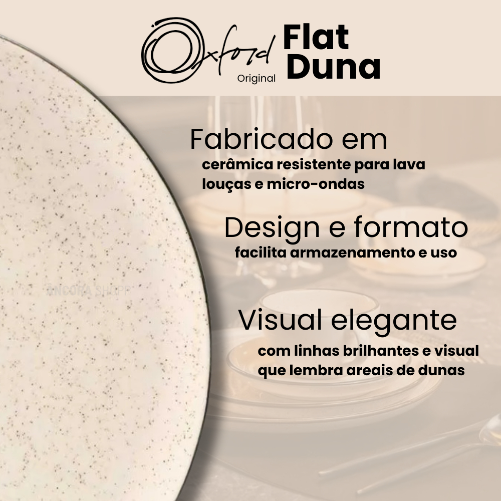 Aparelho de Jantar Oxford Flat Duna 20 Peças Inspirado nas formas naturais das dunas, o Aparelho de Jantar Flat Duna une sofisticação e praticidade para o dia a dia. O design minimalista com linhas retas e acabamento brilhante proporciona um toque moderno e elegante à mesa, ideal para quem valoriza estilo aliado à funcionalidade. A linha Flat foi desenvolvida para otimizar o espaço, com formato inteligente que facilita o armazenamento em armários, mesmo os mais compactos. O visual clean e contemporâneo se adapta a diferentes composições, tornando suas refeições ainda mais especiais. Benefícios: Design elegante e atemporal: combina inspiração natural com estética moderna. Praticidade no dia a dia: peças resistentes ao micro-ondas e lava-louças. Funcionalidade: formato inteligente que ocupa menos espaço no armário. Versatilidade: ideal para compor mesas sofisticadas ou descomplicadas. Conteúdo da Embalagem: 4 pratos rasos – 26 cm 4 pratos fundos – 20,5 cm 4 pratos de sobremesa – 20 cm 4 xícaras de chá 200 ml + 4 pires – 14 cm Especificações: Marca: Oxford Material: Cerâmica de alta qualidade Cor: Marrom, Off White e Branco Decoração: Lisa – Linha Flat Duna Formato: Redondo Uso: Resistente a micro-ondas e lava-louças Embalagem: Caixa litografada (ideal para presentear) Garantia: 90 dias (defeitos de fabricação)