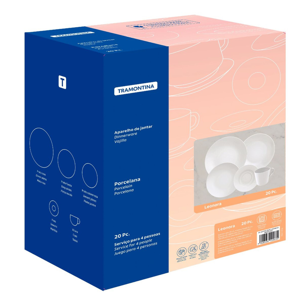 Aparelho de Jantar Tramontina Leonora 20 Peças em Porcelana – Sofisticação, Brilho e Qualidade Superior à Mesa O Aparelho de Jantar Tramontina Leonora leva elegância e cuidado aos momentos à mesa. Com 20 peças produzidas em porcelana de alta qualidade, sua composição se destaca pela brancura, brilho intenso e delicada translucidez – características ideais para quem busca sofisticação em cada detalhe da decoração da mesa posta. Com design atemporal e acabamento refinado, as peças oferecem não apenas beleza, mas também funcionalidade: a baixa porosidade da porcelana evita a absorção de líquidos e impede a proliferação de fungos e bactérias, proporcionando máxima higiene e durabilidade. Perfeito para compor ambientes acolhedores e valorizar ocasiões especiais com charme e estilo. Informações técnicas Fabricado em Porcelana. Uso: Resistente a micro-ondas e lava-louças. Coleção: Leonora. Porosidade próxima de zero, evitando a proliferação de fungos e bactérias. Composto por: 20 peças. Serviço: 4 pessoas. Composição do Kit: 4 Pratos Rasos – 25 cm 4 Pratos Fundos – 21 cm 4 Pratos de Sobremesa – 19 cm 4 Conjunto Xícaras e pires de Chá – 185 ml