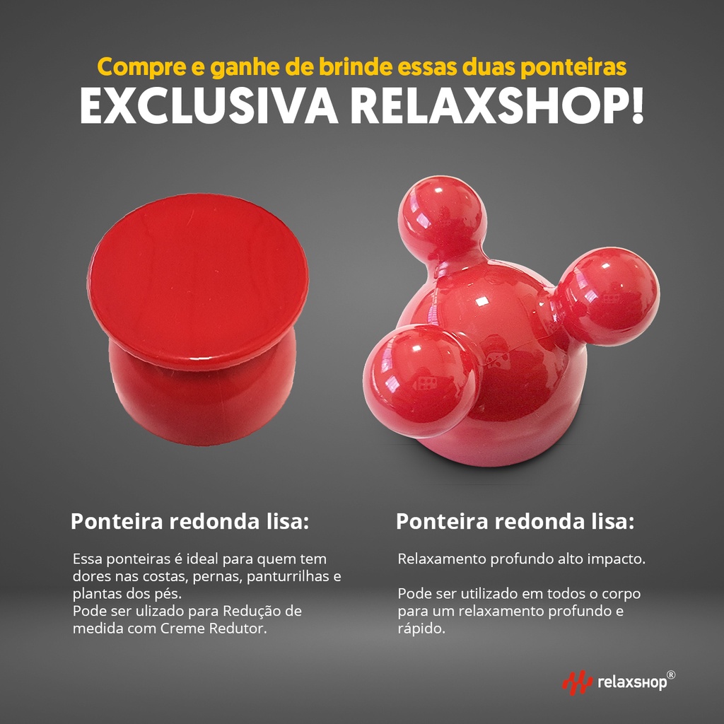 Sejam Bem-Vindos a RELAXSHOP® uma marca reconhecida pelo Instituto Nacional de Marca registrada no BRASIL. Atuamos no segmento de aparelhos portáteis de massagem, há mais de 10 anos e somos uma loja que faz parte do Programa de Vendedores Indicados da Shopee. O que significa LOJA INDICADA? *** Compra 100% segura pela Shopee e Relaxshop®; *** Produto 100% Original; *** Suporte ao Cliente Online exclusivo. Trabalhamos somente com produtos: *** A PRONTA ENTREGA; *** COM NOTA FISCAL; *** PRODUTOS ORIGINAIS. Como saber se o produto é ORIGINAL? É bem simples, precisa acompanhar 6 PONTEIRAS DE MASSAGEM e ter a logo marca da RELAXSHOP. NOSSOS DIFERENCIAIS: *** Postagens Rápidas (no máximo 24h úteis); *** Suporte Online exclusivo; *** Produtos de Alta Qualidade; *** Assistência Técnica Própria. Descrição do Produto: ESTÁ PROCURANDO PRODUTO DE ALTA QUALIDADE ? Alivia as tensões com massagem localizada e relaxante, onde você estiver! Nada como dar aquela relaxada e recuperar a energia depois de um dia corrido! Tudo ficou ainda mais fácil com o Massageador Profissional Elétrico, fácil e rápido se sentir renovado com massagens localizadas que aliviam o cansaço do dia a dia, onde você estiver! Perfeito para usar no corpo todo. Com ele você consegue relaxar e aliviar as tensões dos músculos cansados, garantindo uma sensação agradável por todo seu corpo. Graças ao seu design inteligente, o Massageador Profissional Elétrico facilita o uso em diversas regiões do corpo. O Massageador Profissional Elétrico Confort acompanha 6 ponteiras de massagem para obter resultados diferenciados: Diferenciais das ponteiras: - Ponteira redonda: ideal para dores nas costas, lombar, pernas, panturrilhas e planta dos pés; - Ponteira com 2 pontos grande é de silicone: sensacional para dores no pescoço, braços, pernas e panturrilhas; - Ponteira com 3 pontos: relaxamento profundo de alto impacto; - Ponteira lisa: perfeita para áreas delicadas; - Ponteira com 5 pontos: relaxa o corpo e cria uma deliciosa sensação de bem-estar; - Ponteira concentrada com 1 ponta: alívio profundo para as tensões do dia-a-dia. **Para a troca das ponteiras rosquear gentilmente para retirar e rosquear novamente para encaixar uma nova. INDICAÇÕES: - Relaxamento; - Alívio da tensão; - Dores musculares; - Melhora da circulação sanguínea; - Alívio da fadiga. TIPOS DE MASSAGEM: - Massagem no Pescoço; - Massagem de Cintura; - Massagem no Abdômen; - Massagem na Coxa; - Massagem no Braço; - Massagem nas Pernas. ITENS INCLUSOS: - 1 Massageador Elite Confort; - 6 Ponteiras de Massagem. OBS: TEMOS ESSE MESMO MODELO DE MASSAGEADOR AGORA SEM FIO. CASO QUERIA COMPRAR O MODELO SEM FIO, SEGUE O LINK DO ANÚNCIO ABAIXO OU SOLICITE PELO CHAT DE PERGUNTAS. https://shopee.com.br/product/417707388/16402796287/ Dados Técnicos: Peso: 900g Dimensão: 10X36X9cm Forma de usar: Ligado na tomada Aplicação: Corpo todo Marca: Relaxshop Garantia: 12 meses Cor: Branco e cinza Frequência: 50-60 Hz Potência: 28 W Velocidade: 2 níveis Voltagem: 110V ou 220 V Tamanho do cabo: 1,80M Rotação: 2.850 RPM