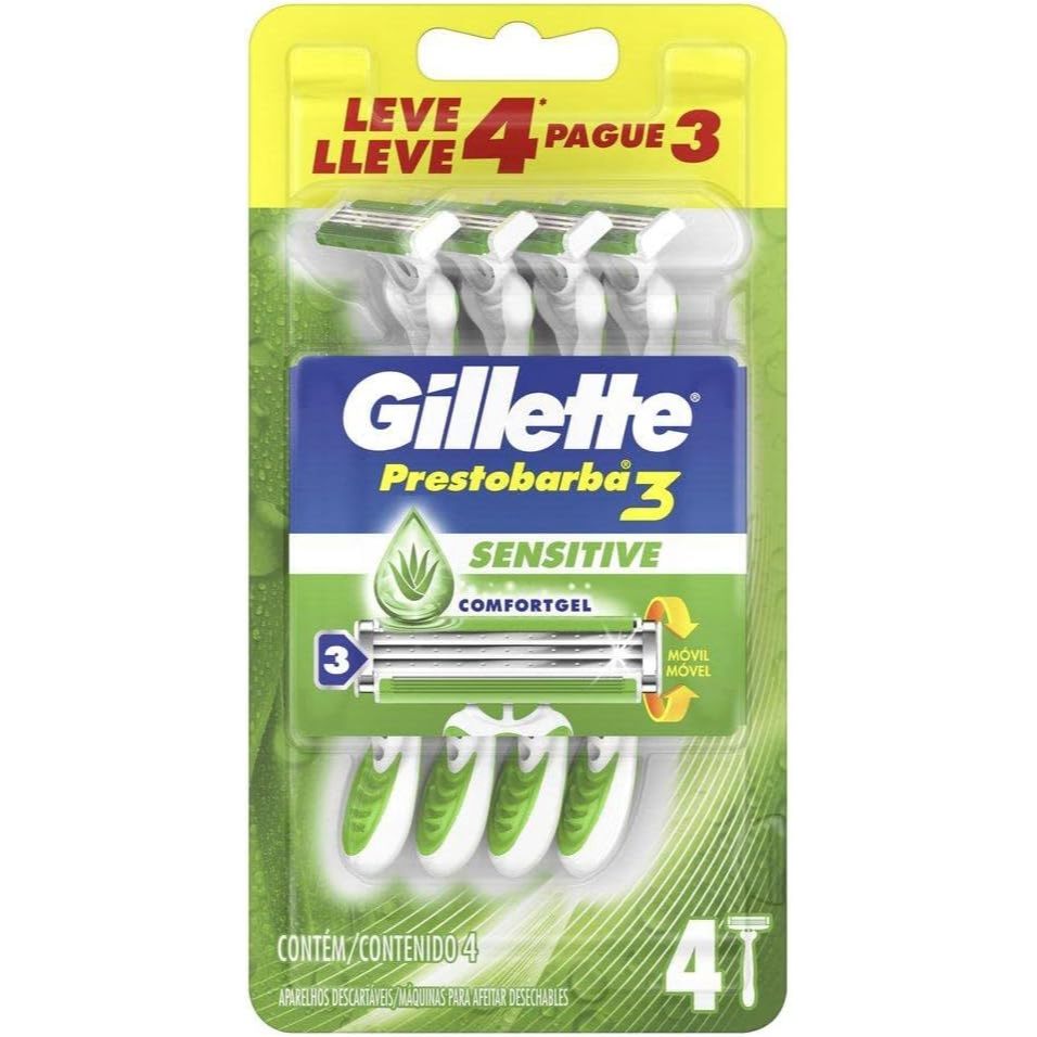 Aparelho de Barbear Gillette Prestobarba3 Sensecare - Leve 4, Pague 3 Principais Características - Três lâminas de alta performance: Proporcionam um barbear rente e preciso com menos irritação. - Fita lubrificante com Aloe Vera e Vitamina E: Ajuda a suavizar a pele e reduzir o atrito durante o barbear. - Cabo ergonômico e antideslizante: Garante maior controle e segurança durante o uso. Benefícios - Experiência de barbear confortável e suave. - Redução da irritação, ideal para peles sensíveis. - Excelente custo-benefício com a promoção "Leve 4, Pague 3". Diferenciais do Produto - Tecnologia Sensecare, que proporciona um barbear mais confortável e seguro. - Fita lubrificante enriquecida para uma pele mais hidratada após o barbear. - Embalagem promocional para mais economia e praticidade. Especificações Técnicas - Peso: Informação não disponível. Instruções de Uso - Molhe o rosto com água morna e aplique espuma ou gel de barbear. - Passe o aparelho suavemente na direção do crescimento dos pelos. - Enxágue as lâminas regularmente durante o uso. Avisos e Precauções - Evite pressionar o aparelho com força excessiva para não irritar a pele. - Mantenha fora do alcance de crianças. - Substitua o aparelho quando notar desgaste na fita lubrificante ou perda de eficiência das lâminas. O que está incluso? - 4 unidades do Aparelho de Barbear Gillette Prestobarba3 Sensecare (promoção Leve 4, Pague 3). ---- DÚVIDAS FREQUENTES ---- Os produtos são originais? Sim. Todos os nossos produtos são originais. Emitem nota fiscal? Sim. Emitimos nota fiscal para todos os pedidos.