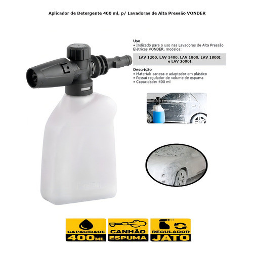 Indicado para limpeza leve automotiva, pois proporciona espuma intensa (floculação/flotação), desde que utilizado com detergentes que proporcionam este efeito. Utilizado nas lavadoras de alta pressão elétricas VONDER, modelos: LAV 1200, LAV 1300, LAV 1400, LAV 1600, LAV 1800, LAV 1800I, LAV 2000, LAV 2000I e LAV 2030I. Possui regulador de volume de espuma. Contém: - 1 Aplicador de Detergente vonder Detalhes Técnicos: - Proporciona Espuma Intensa - Caneca e Adaptador em Plástico - Regulador de Volume de Espuma - Indicado para Limpeza Automotiva - Ideal para Lavadoras Elétricas de Alta Pressão Vonder (LAV 1200, LAV 1400, LAV 1800, LAV 1800I e LAV 2000I) - Capacidade para 400 ml - Cor: Transparente e Preto Vantagens: - Alta Resistência e Durabilidade - Produto de Qualidade - Produto a Pronta Entrega *Imagens Meramente Ilustrativas *O design do produto não interfere em sua funcionalidade *Os produtos podem sofrer alterações no design pelo fabricante