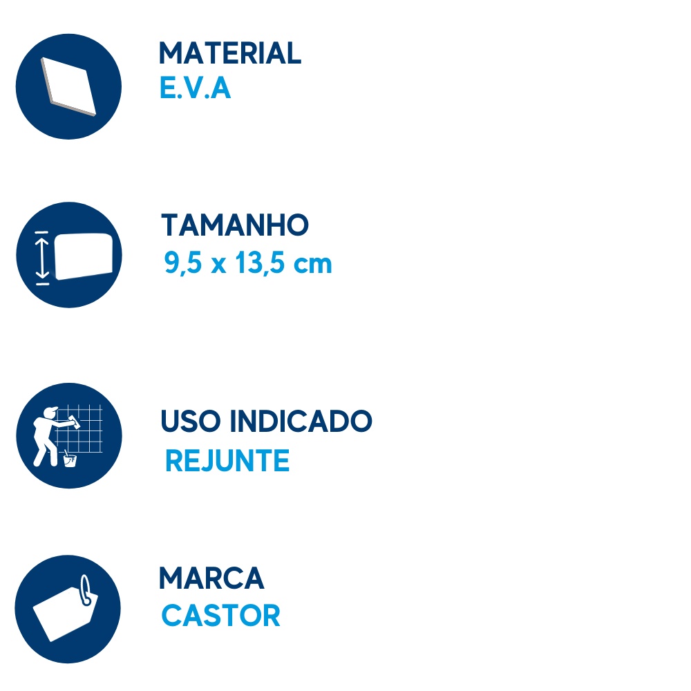 O E.V.A para rejunte da Castor, é indicado para a aplicação de rejuntes cimentícios. Sua borracha é flexível na medida certa e oferece alta eficiência durante o rejuntamento, não agredindo ou riscando o revestimento cerâmico. CARACTERÍSTICAS Aspectos: Leveza e flexibilidade. Uso indicado: aplicação de rejuntes e confeccção de efeitos decorativos. Material: E.V.A Dimensões: 13,5 cm x 9,5 cm x 1,2 cm Diferencial: Multiuso e pode ser utilizado diversas vezes. Código do fabricante: 098 Limpeza e Conservação: Logo após o uso, retire os resíduos do produto utilizado e lave o aplicador com água corrente, sabão ou detergente, de preferência neutro. Não utilize produtos abrasivos para limpar a borracha. Guarde em local arejado. FERRAMENTAS QUE COMPLEMENTAM Para você que precisa de produtos especiais para ajudar a pintura a render mais, além de otimizar o tempo do trabalho, a Castor tem a solução! A linha de Especiais para Pintura oferece tudo que você precisa para conseguir um resultado profissional em todos os seus trabalhos. SEGURANÇA Compre com segurança! Nossa equipe de suporte sempre estará à disposição caso tenha algum problema ou dúvida. Aguardamos seu pedido!