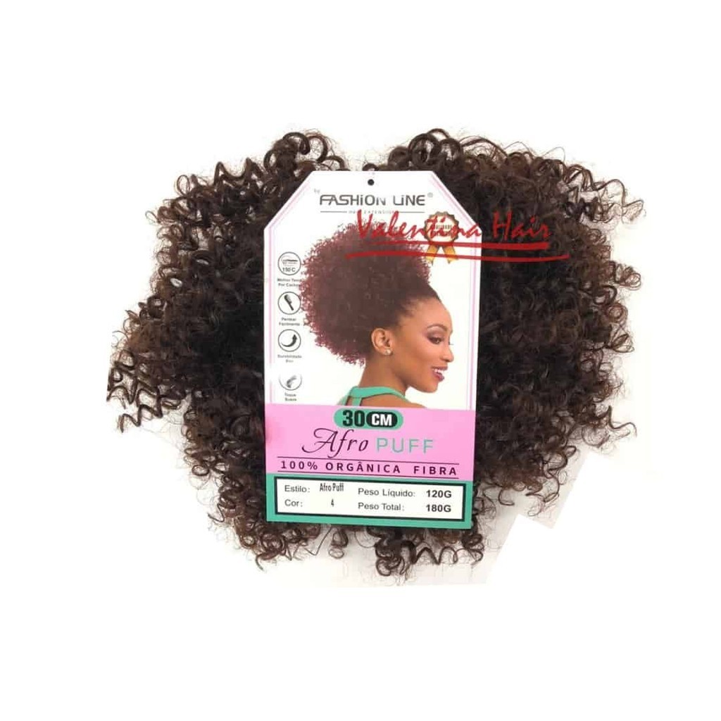 Modelo em colocação como aplique de afro puff com textura macia e bem semelhante ao cabelo natural.Contém 1 rabo para colocação com comprimento de 30cm, suporta temperatura de até 150ºC para modelar, contém 120gramas.