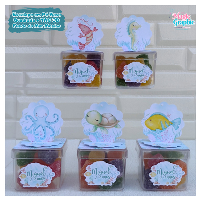 Aplique em Pé 3D Base Quadrada + Tag Personalizada Fundo do Mar Menino Lembrancinha Festa