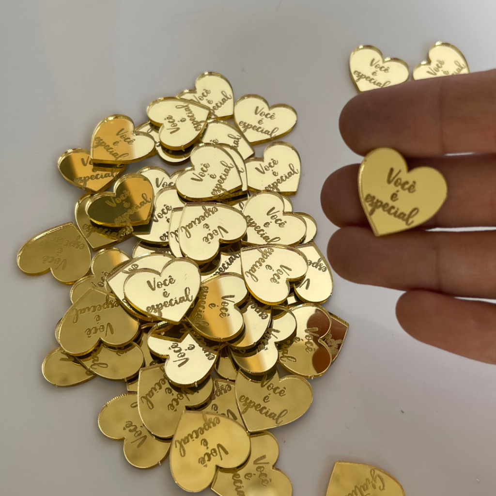Aplique Gratidão Você é especial Tag Coração Acrílico Espelhado Dourado Prata e Rose