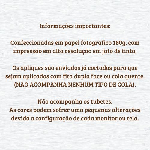 LEIA ATENTAMENTE ANTES DE COMPRAR Informações importantes: Confeccionadas em papel fotográfico 180g, com impressão em alta resolução em jato de tinta. Os apliques são enviados já cortados para que sejam aplicados com fita dupla face ou cola quente. (NÃO ACOMPANHA NENHUM TIPO DE COLA). Não acompanha os tubetes. As cores podem sofrer uma pequenas alterações devido a configuração de cada monitor ou tela.