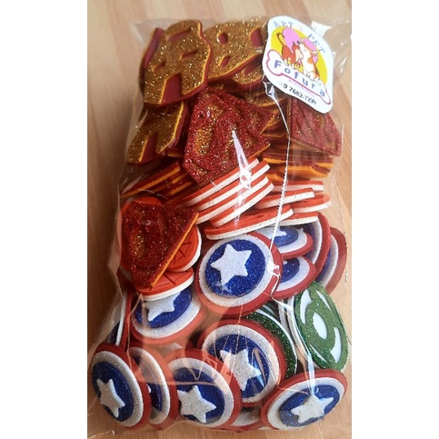 Aplique EVA - Misto Heróis ***ATENÇÃO*** **APLIQUES NÃO ADESIVADOS - NÃO SÃO PARA COLAGEM NO PELO** Quantidade: 50 Unidades Modelos: 10 - Homem Aranha 10 - Homem de Ferro 10 - Super Homem 10 - Lanterna Verde 10 - Capitão América Cores: Semelhantes a Foto Tamanho Aproximado: Variam de 3,0 a 4,5cm **Produzidos em EVA de ótima qualidade, sugestão de uso Laços Pet tamanho P e M e G.** **Kit fechado, não sendo possível escolher os modelos**