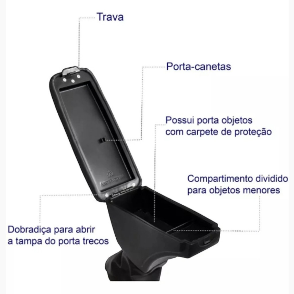 Apoio de Braço Encosto Ford New Fiesta Hatch 2013 a 2019 Courvin Descanso Central Porta Objetos Modelos Compatíveis: - Ford New Fiesta Hatch 2013 a 2019 Compatível para todas as versões com console central a partir de 2013 à 2019; Especificações Técnicas: - Material da tampa: Courvin de alta durabilidade- - Tipo de abertura: Articulado (tampa alcochoada com abertura para cima) - Estrutura interna: aço carbono reforçada - Base inferior: acabamento emborrachado para melhor encaixe - Articulação: dobradiça resistente com sistema de trava - Compartimentos internos: porta-objetos e porta-caneta - Instalação: encaixe direto no console, sem necessidade de furar ou colar - Cores: Cinza, Grafite e Preto - Dimensões aproximadas: largura 10 cm, comprimento 28 cm, altura 35 cm - Peso aproximado: 1,6 Kg Instalação: A instalação é simples e pode ser feita em casa, não é necessário furos ou cola, pois o Apoio de Braço é apenas encaixado no console central. A base do Apoio é feita de aço carbono com parte inferior emborrachada e moldada sob medida, tendo encaixe firme e perfeito no veículo! Função: - Proporcionar mais conforto e ergonomia ao motorista, servindo como apoio para o braço durante a condução e oferecendo um compartimento interno para armazenar pequenos objetos como chaves, moedas, celular e carteira. Benefícios: - Aumenta o conforto durante viagens e uso urbano - Melhora a postura e reduz a fadiga do braço - Porta-objetos espaçoso para maior organização - Revestimento resistente e fácil de limpar - Instalação rápida e sem modificações no veículo - Acabamento elegante que combina com o interior do New Fiesta - Produto original Artefactum com excelente padrão de qualidade Conteudo da Embalagem: - 1 Apoio de Braço