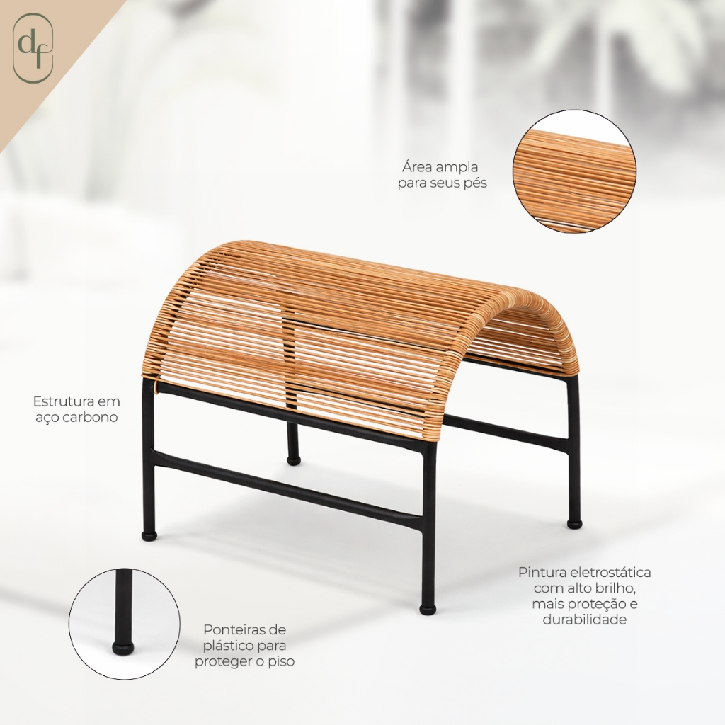 DESCANSO DE PÉ FIBRA SINTÉTICA *Limite de 2 unidades por compra para evitar avarias no transporte* CARACTERÍSTICAS: - Produto fabricado em aço carbono, pintura eletrostática, estabilizante UV, para retardar a degradação quando exposto ao tempo (sol e chuva). Portanto, pode ficar exposto ao tempo. - As imagens são ilustrativas. As cores podem sofrer pequenas alterações de acordo com o lote do material utilizado. - Indicado para áreas interna e externa, varanda, piscina, área gourmet, recepção, espaço comercial e sacadas. ENTREGA E MONTAGEM: - Os apoios são entregues montados INSTRUÇÕES DE LIMPEZA: - Item de fácil manutenção. Utilizar apenas sabão ou detergente neutro com esponja macia. - Não usar solventes, objetos cortantes ou abrasivos. - Não deixar exposta a situações climáticas adversas por longos períodos. MEDIDAS DETALHADAS: - Altura: 43cm - Largura: 42cm