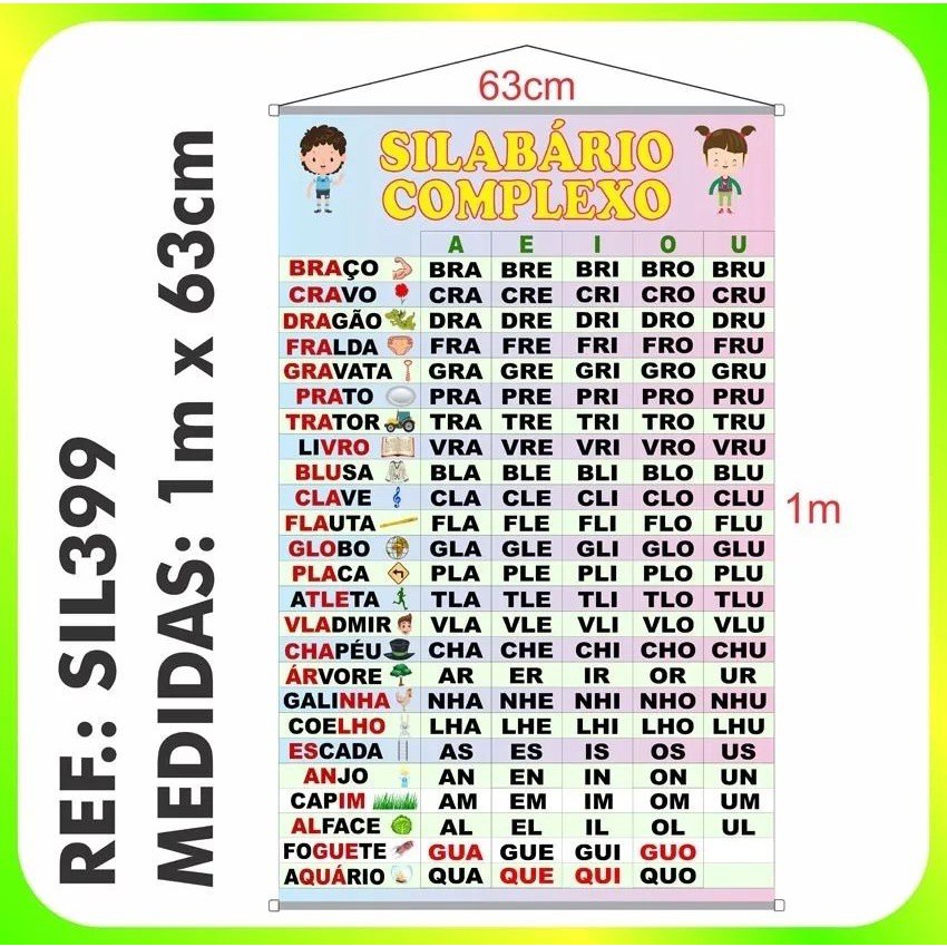 Seja Bem-Vindo! Leia todo anúncio e assim compre com total tranquilidade. Apoio Pedagógico Com Banner De Silabas Complexas Sil399 Código de Referência: Sil399 CARACTERÍSTICAS DO PRODUTO: - Banner confeccionado com lona de alta resistência estampada com equipamentos profissionais de última geração proporcionando ótima qualidade de impressão. - Objetivo: Material de Apoio Pedagógico. Auxiliar professores, pais ou qualquer um interessado no aprendizado de nossas crianças. Elas são o futuro do nosso Brasil. - Medida da área impressa: 1 metro x 63 centímetros. - Medida total do banner pronto com acabamento: 1,10m x 67cm. - Medida do banner enrolado: 5 cm x 67 cm. - Peso aproximado do banner: 400g - Inclui acabamento com madeira e ponteiras plásticas brancas nas partes inferior e superior e cordinha branca na parte superior. PRONTO PARA PENDURAR! - Arte estampada fiel à arte exibida no anúncio. - No verso do banner há indicado e reservado um espaço destinado a escrita manual do nome do proprietário com caneta permanente para identificação do mesmo. - Tinta não toxica (Eco-solvente) - Lavável (Pano macio, úmido, sabão ou detergente neutro sem abrasivos) NOSSOS DIFERENCIAIS - Fabricação Própria / Estoque ilimitado / Disponibilidade imediata. - Múltiplos equipamentos de fabricação permitindo a continuidade ininterrupta da produção mesmo em caso de problemas técnicos pontuais. - Postagens no mesmo dia da compra ou no máximo no dia útil seguinte minimizando ao máximo possibilidades de atrasos na entrega. - Vasto Catálogo – Mais de 50 modelos pra você escolher! - Gratidão - Equipe PaxArt