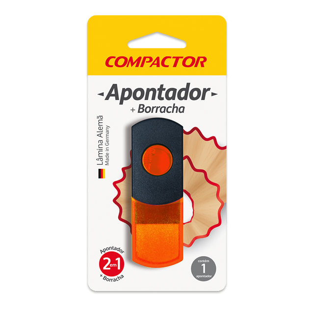O Apontador 2 em 1 é a novidade da Compactor e tem dupla função. Além de apontar o lápis, o Apontador 2 em 1 vem com borracha macia, fácil de apagar e com menos resíduos. Fabricado na Alemanha, o Apontador 2 em 1 possui lâmina de altíssima qualidade que não enferruja e nem fica cega, trazendo perfeição ao apontar seu lápis. O Apontador 2 em 1 também conta com reservatório para resíduos de pontas que evita sujeira, além de capa protetora para borracha. O Apontador 2 em 1 tem duas opções de cores. Qual é a sua preferida? • Apontador e borracha juntos • Reservatório para resíduos de pontas. Evita sujeira. • Capa protetora para borracha • Lâmina de altíssima qualidade