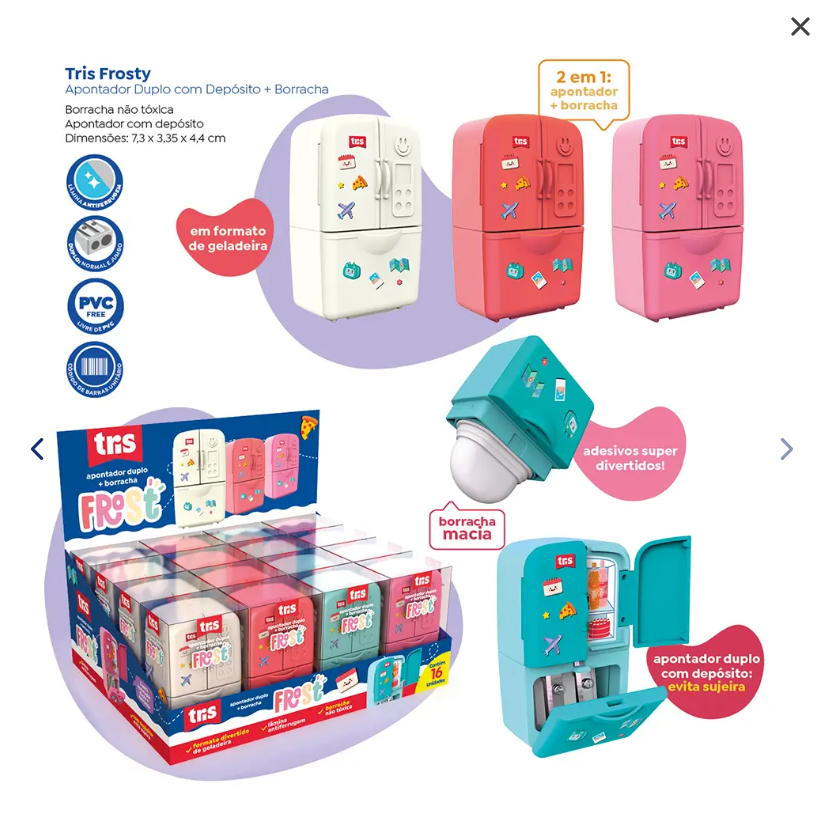 | Apontador Duplo com Depósito + Borracha Frost - Cores Sortidas TRIS este produto | R$ 26,90 | — | 4.9/5 | 17 |