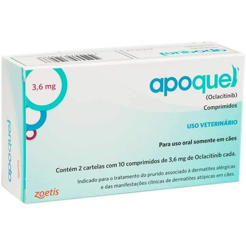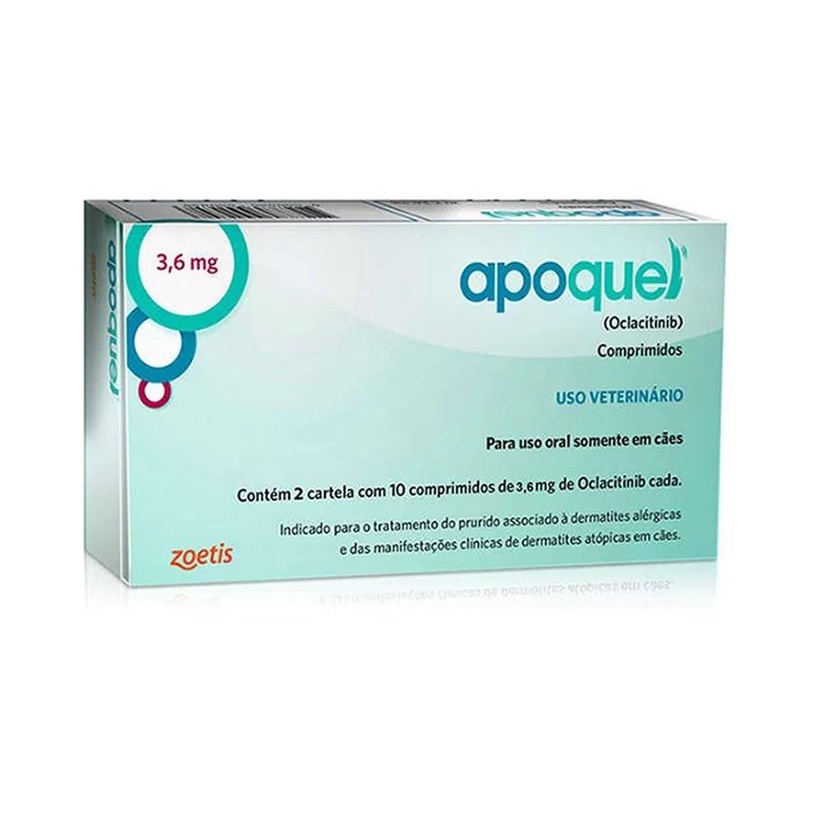 Apoquel 3,6mg Cães - Zoetis - Alivia a coceira em até 4 horas; - Uma dose garante 24 horas de efeito; - Uso oral indicado apenas para cães; - Não aplicar em cães com menos de 12 meses de idade; - Os efeitos se mantém eficazes a longo prazo; - Não contêm corticóides, ciclosporina ou anti-histamínico. O Apoquel é um remédio para dermatite canina, indicado para aliviar a coceira e proporcionar mais tranquilidade ao seu cãozinho. Diferente de outros medicamentos como a corticoide, ciclosporina ou anti-histamínicos, o Apoquel é o único tratamento que age diretamente no causador da coceira. Isso resulta em efeitos mínimos em outras partes do corpo do cão. Seu efeito é rápido e proporciona sensação de alívio e bem-estar durante um dia inteiro, permitindo que o seu bichinho fique mais relaxado e até durma melhor. A coceira constante pode estressar o animal, o que reflete em mudança no humor, no comportamento e até mesmo no relacionamento com o dono. Como identificar a dermatite canina? O ideal é que o dono procure um médico veterinário. Contudo, preste atenção no comportamento do seu cãozinho e veja se ele apresenta algumas dessas ações: Lamber, mordiscar ou se arranhar excessivamente; Rolar ou se esfregar constantemente; Morder as patas continuamente. Além disso é possível notar a dermatite por meio feridas ou coloração escura na pele e alteração de odor no corpo do animal.