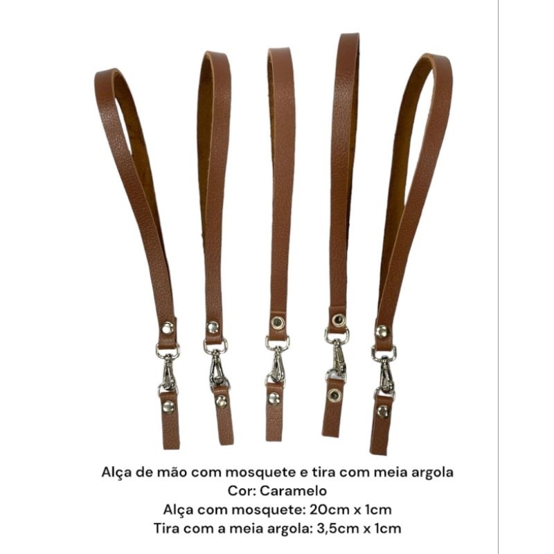 Kit contendo 5 alças de mão em couro montana. Aproveite para deixar suas peças ainda mais bonitas. Cada alça possui 1 cm de largura e seu comprimento cerca de 18 cm. Acompanha uma tira de couro com meia argola na medida de 1 cm de largura x 3,5cm de comprimento.