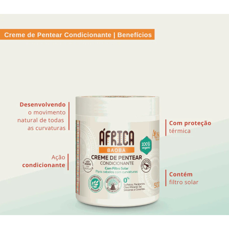 Creme de Pentear África Baobá 500g- Ação Condicionante Ideal para quem busca o movimento natural da sua curvatura. Liberado para No Poo e Low Poo USO DIÁRIO – SEM ENXÁGUE – Não deixa resíduo! Com proteção térmica e Ação Condicionante.! Para cabelos de todos os tipos de curvatura. pH - 3,5 a 4,5 aproximadamente. Enriquecido com: Óleo de Baobá: Por ricos em vitaminas, é absorvido pelo cabelo e assim, auxilia no brilho dos fios, protegendo-os da radiação solar, água do mar e do cloro da piscina. Também ajuda a manter as cores por mais tempo, pois previne o desbotamento. Rico em vitaminas A,D, E e F, hidrata e nutre os fios. Quando usado no comprimento do cabelo, ajuda a restaurá-lo, deixando-o mais saudável e, naturalmente, mais bonito. Kao softcare GP-1: Proteção térmica que retém a água na fibra capilar, formando uma película protetora. MODO DE USO Após lavar e condicionar os cabelos com a linha África, aplique nos cabelos úmidos o Creme de Pentear com o auxílio de pente ou utilizando sua técnica de aplicação favorita. Não é necessário enxaguar.